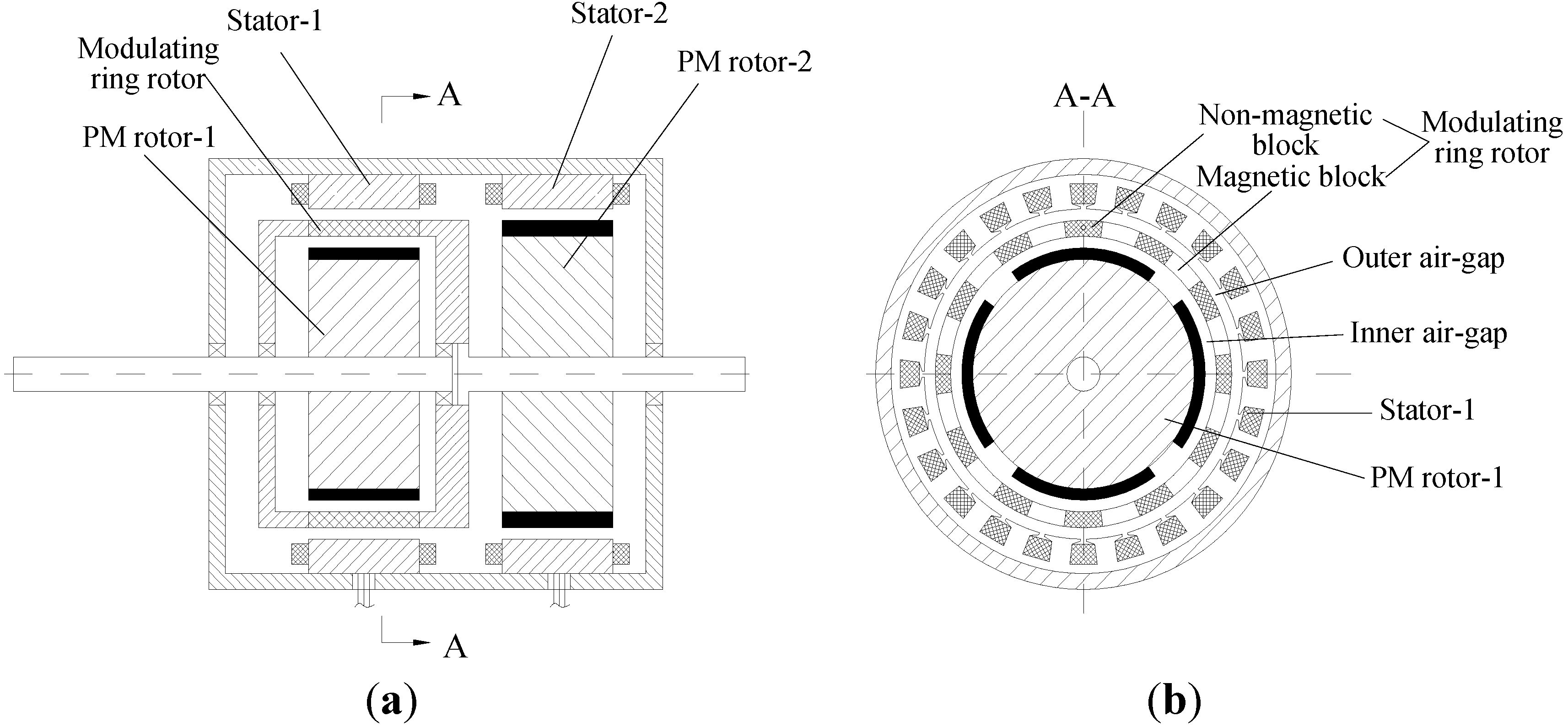 (a) The flux-modulated CS-PMSM; (b) The cross section of the brushless DRM.