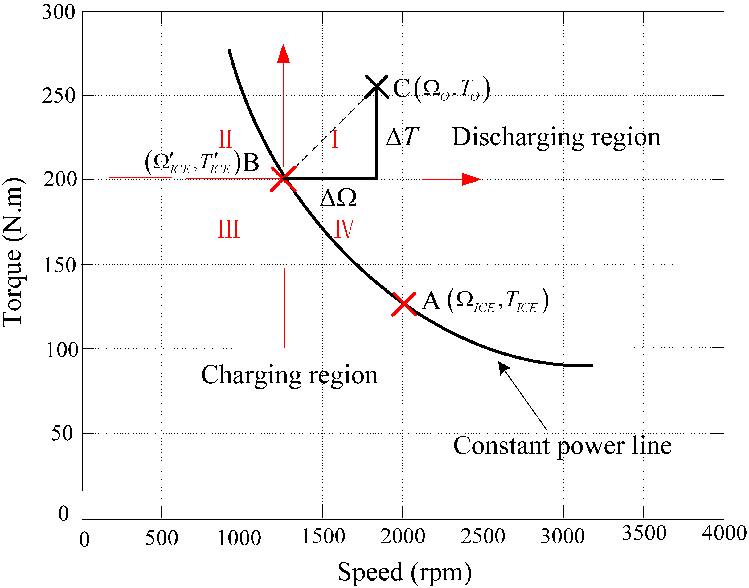 For all possible driving output, the battery is discharged when the point C is above the constant power line and charged when it is under the line. By dynamic controlling the operating point of ICE, the battery SOC can be maintained for sustainable running.