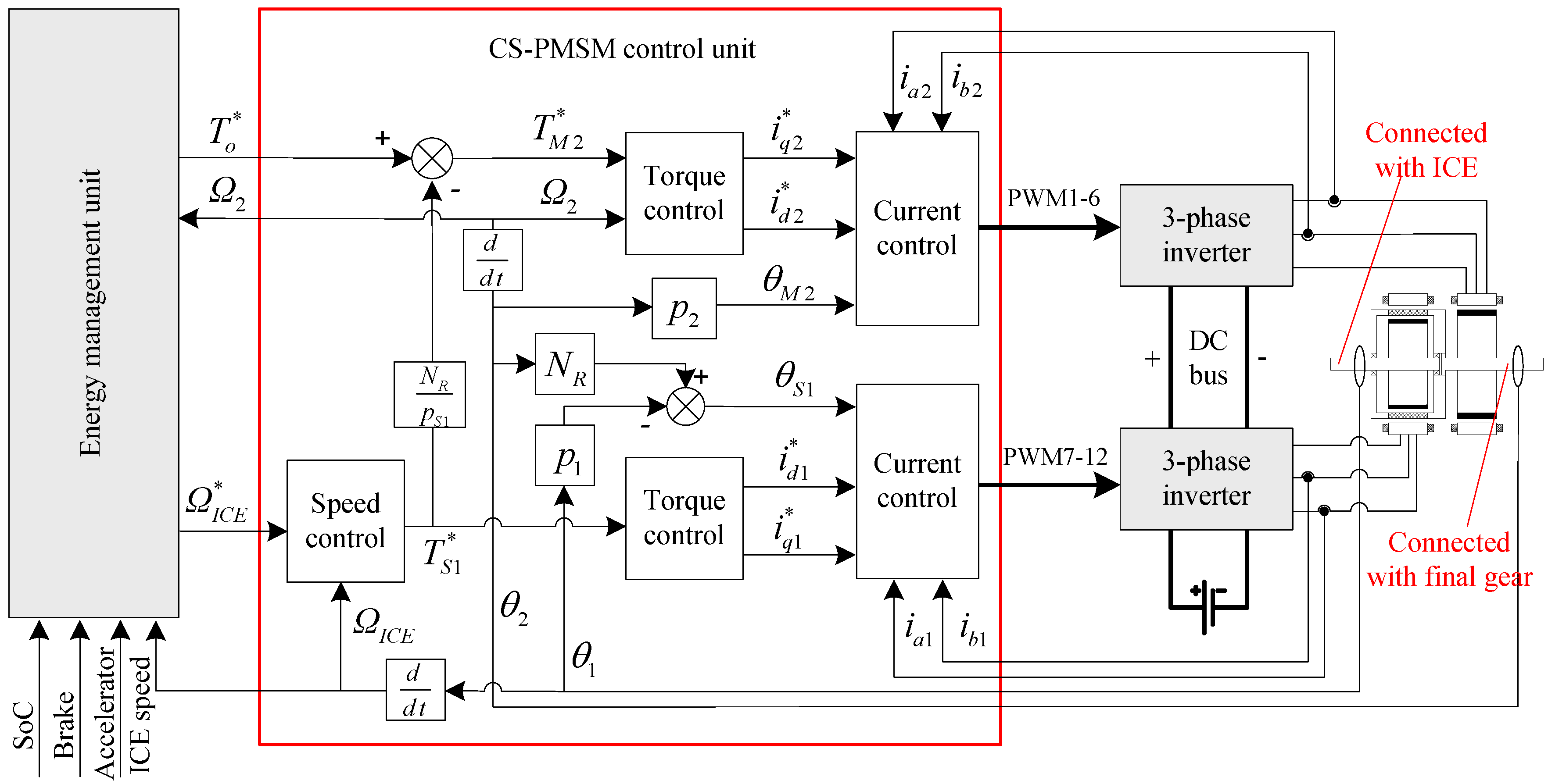 The CS-PMSM has proposed two challenges for conventional controllers. Firstly, the mechanical speed coupling between the DRM and motor-2 requires dual position feedback of the input and output rotors for the DRM controller. Secondly, the overall output torque comprises the contributions of both machines, although they are electrically independent, and coordinated system control is required for joint operation. Considering the compound structure and HEV application, the use of two individual conventional controllers is not justified. Since conventional controllers only accept absolute position or speed feedback and are simply applied to control one machine, a special controller is proposed in this paper, as shown in Figure 4. Control algorithm is implemented by one digital signal processor (DSP; e.g., TMS320F2812) instead of two separate ones, which is preferred for both functional and cost concerns.