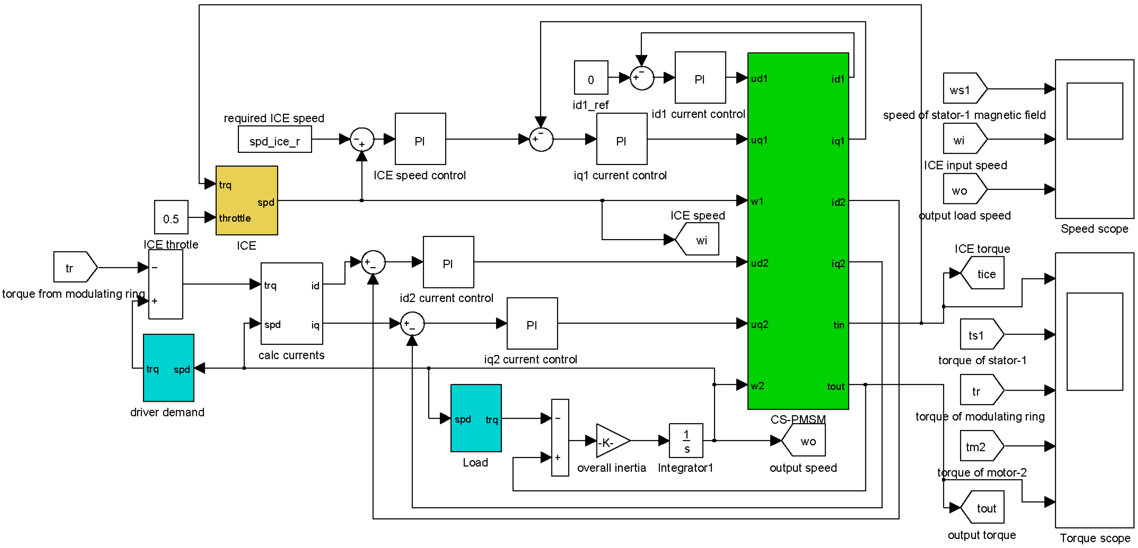 Field oriented control (FOC) is applicable to both DRM and motor-2. The DRM shown in Figure 2(b) exhibits little reluctance torque in tentative simulations. The winding inductions of d- and q-axis of stator-1 are quite close. Thus the DRM can be treated as a surface-mounted PM machine and id = 0 method is adequate for the torque control. The reference value for the torque control loop of DRM is given by speed control loop of ICE. Torque reference for motor-2 is then calculated according to the transferred torque input (i.e., ICE torque delivered via PM rotor-1 to modulating ring rotor) and required overall torque output. Rotary inertia and resistance drag are neglected, as is adjusted according to driver demand. The magnets of motor-2 are inset on the outer rotor with salient-pole structure, so field weakening methods can be used to extend its operating domain.