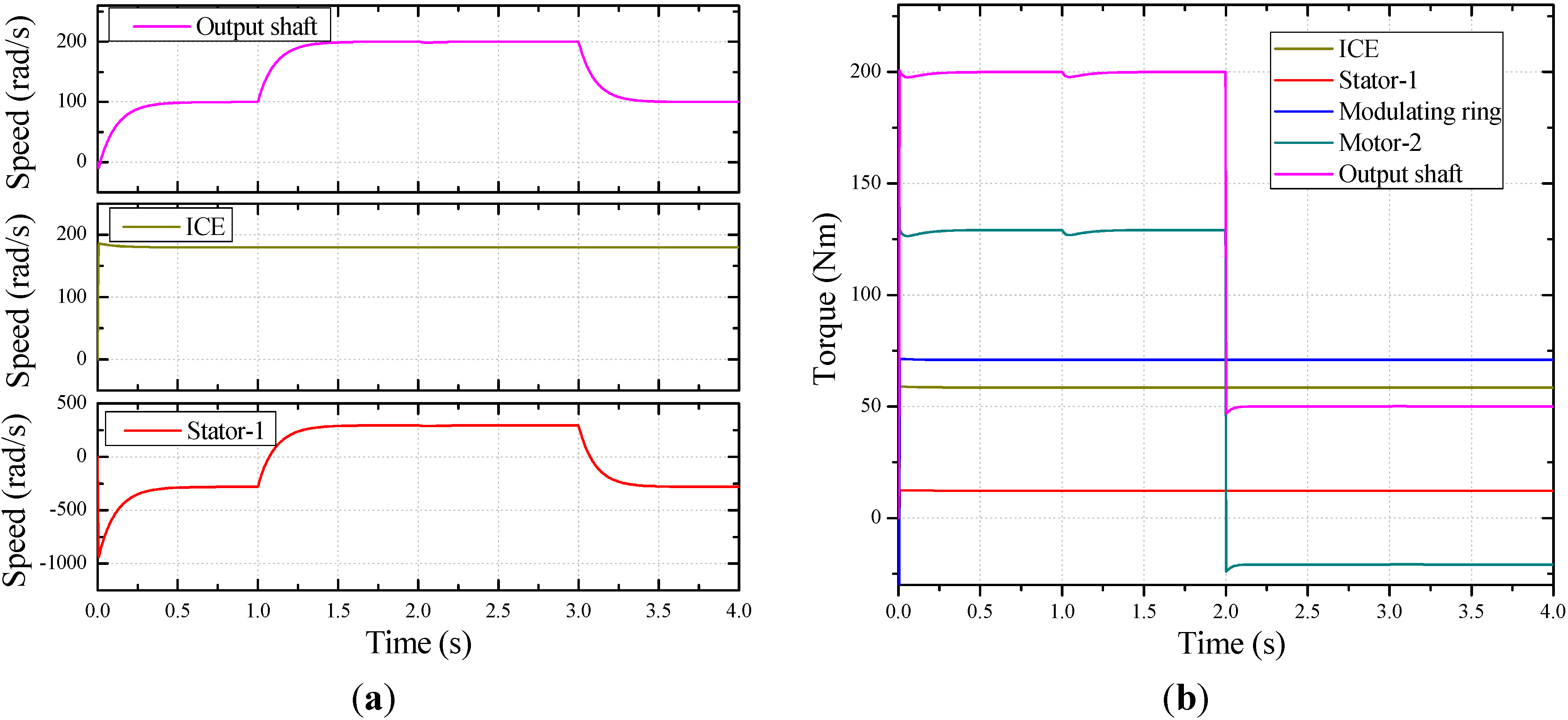 Simulated speed and torque waveforms: (a) Speeds of output shaft, ICE and rotating magnetic field generated by stator-1; (b) Torque delivered from ICE, electromagnetic torque of stator-1, torque delivered to modulating ring, electromagnetic torque of motor-2 and torque of output shaft.