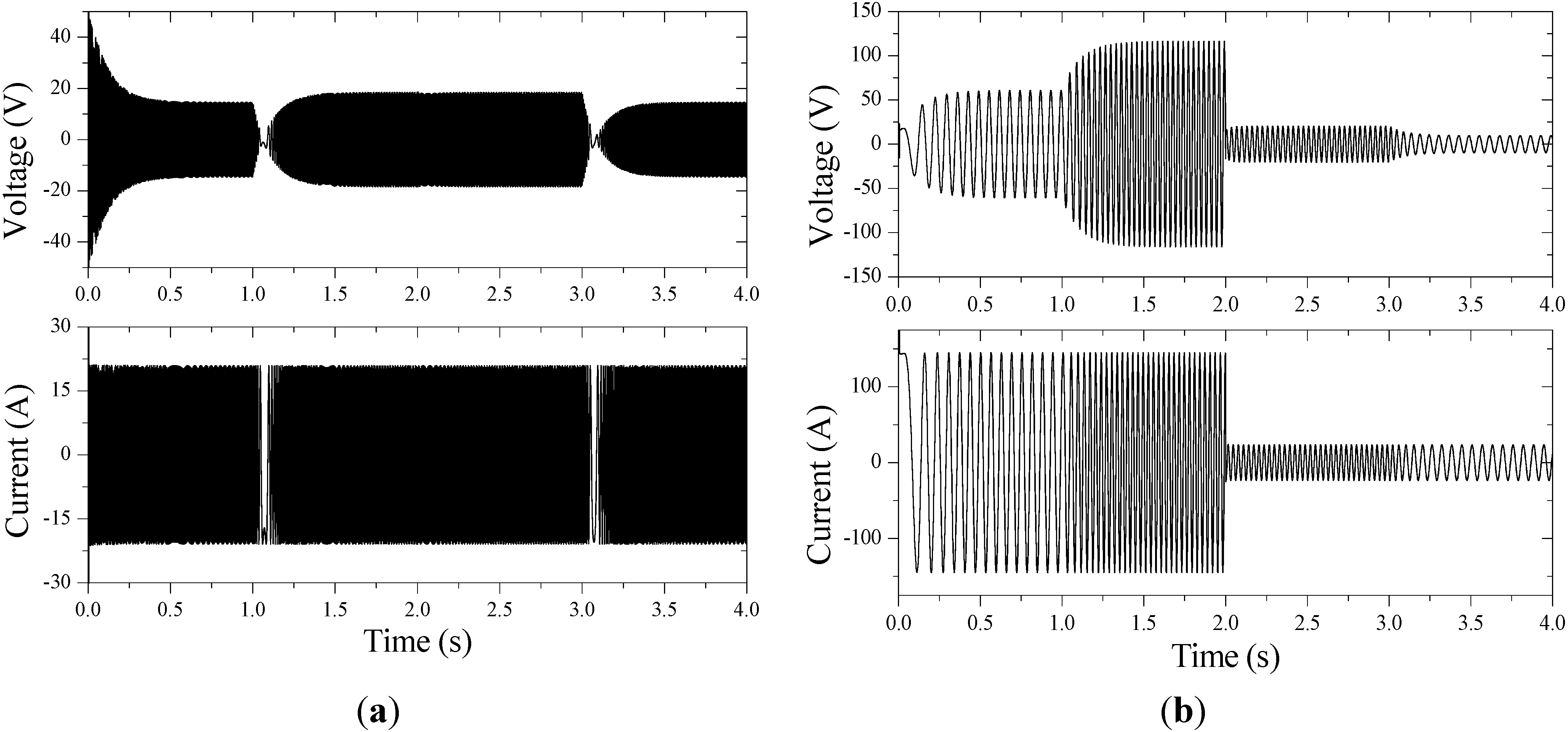 Phase voltage and current waveforms of DRM and motor-2: (a) DRM; (b) Motor-2.