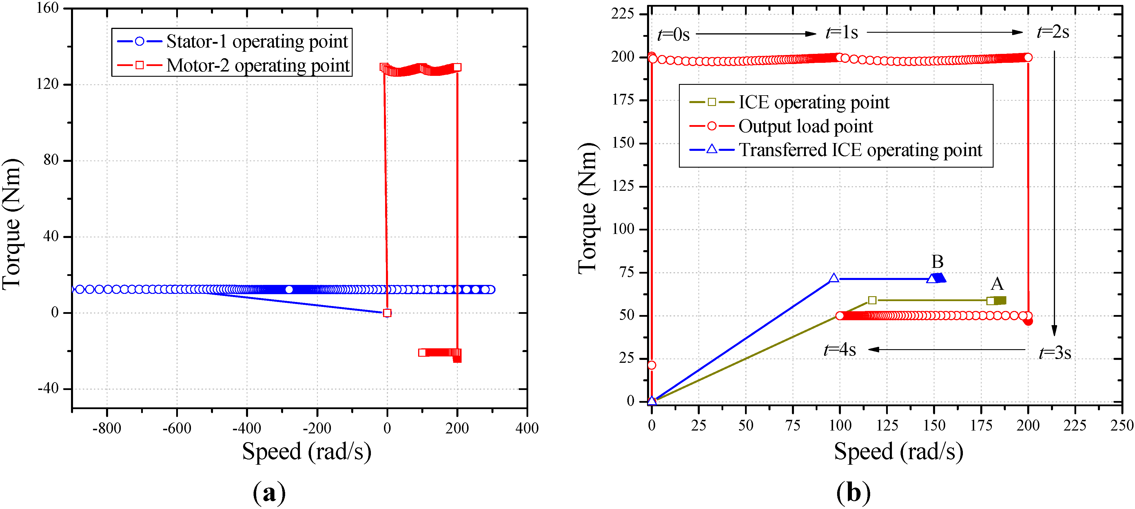 Historical speed-torque points: (a) Stator-1 and motor-2 operating points; (b) ICE, output load and transferred ICE operating points.