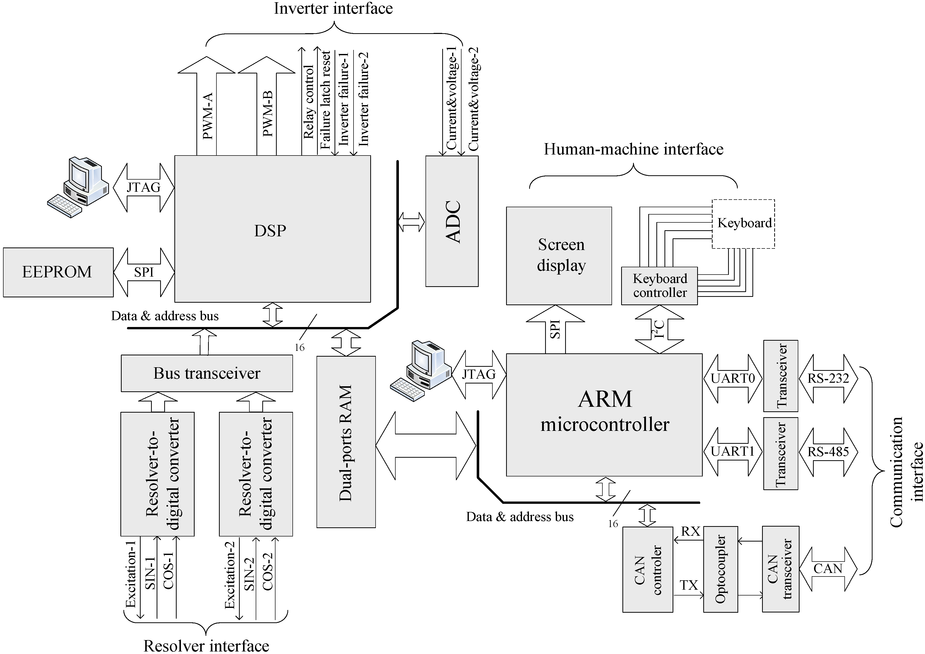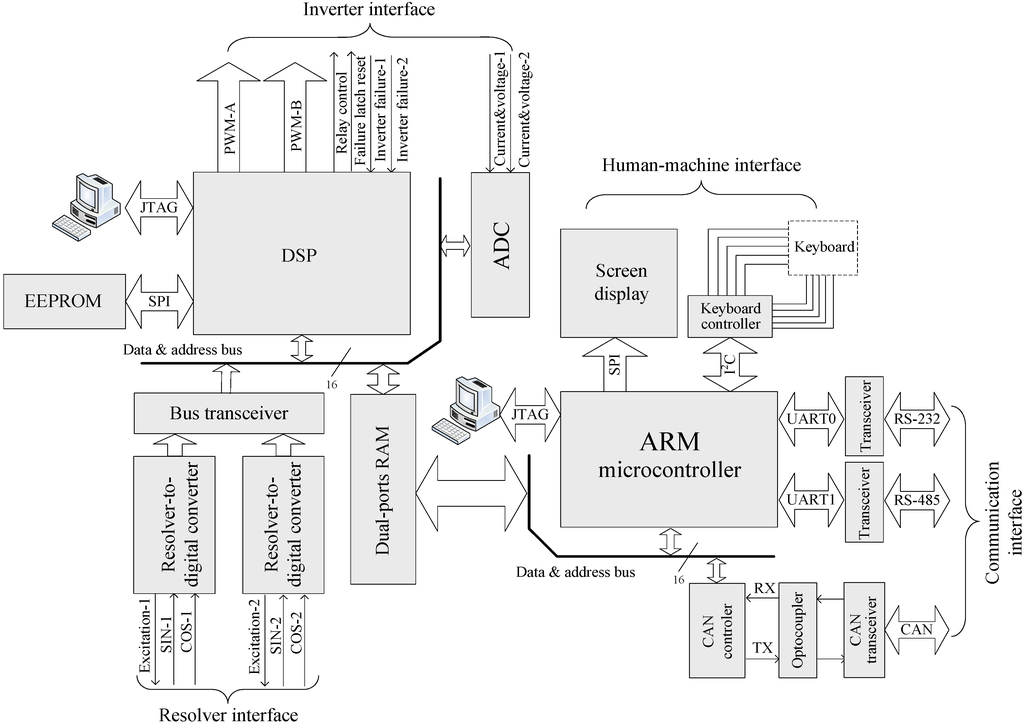 The controller is designed with two cores: one DSP and one ARM microcontroller, as shown in Figure 9. The DSP implements the CS-PMSM control algorithms. The inverter and resolver interface enables control of two inverters and position acquisition of two resolvers. The ARM microcontroller is used for human-machine interface and communication, so the DSP can handle the control algorithms in time. A dual-port static RAM is employed as the data buffer between the DSP and the ARM microcontroller. The DSP messages the ARM microcontroller status data such as current, speed and torque values, via the dual-ports RAM. Likewise, ARM microcontroller notifies the DSP the values of control parameters, such as reference values of ICE speed, output torque, and brake or accelerator position. Figure 10 shows the designed controller and two inverters for a 20 kW CS-PMSM.