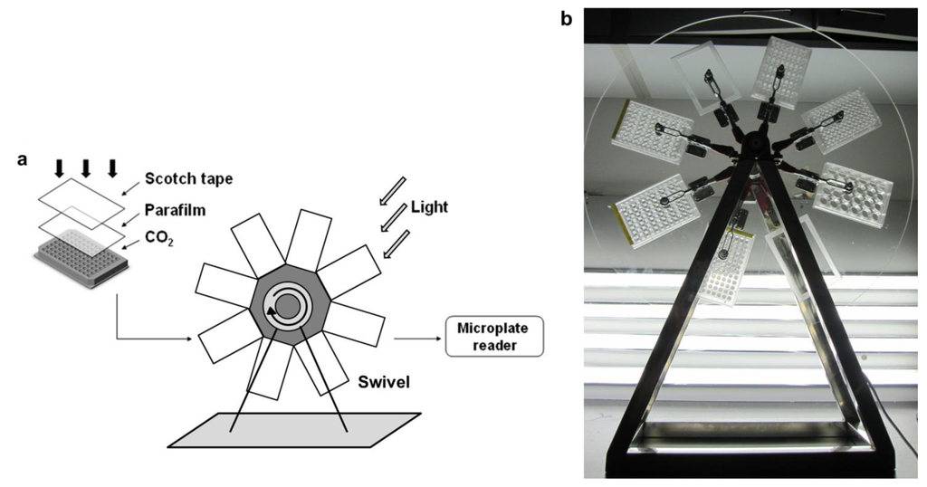 (a) Schematic diagram of the 96-well microplate swivel system. Different concentrations of CO2 were sealed into each microplate by 2 membrane layers. External continuous illumination at 180 μmol m−2 s−1 was provided by cool white fluorescent lights. During cultivation, microplates on the swivel were rotated vertically. Cell density was measured daily with a microplate reader; (b) Photo of 96-well microplate swivel.