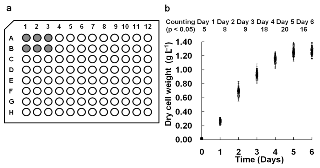 Strain selection is one of the most critical links in microalgae research and application. Traditional screening processes cultivate algal strains in flasks under different screening conditions [4]. Such methods provide reliable screening results, but are time consuming and labor intensive [5]. Some miniature culture technologies have been used to increase experimental throughput in microalgae research [6,7,8]. Most of these are adaptations of Lukavský’s [9] system. Lukavský [9] cultivated microalgae for toxin bioassays in 96-well plates in a closed flat box containing CO2. Later researchers [5,10] verified the agreement between Lukavský’s [9] system and the flask culture system for bioassays. However, these authors did not address similarities and differences between microalgal growth characteristics in miniature and flask culture. At the same time, intra-well mixing and sample evaporation were also identified as critical issues in miniature culture systems [11]. Poor intra-well mixing leads to cell sedimentation while excess mixing greatly increases sample evaporation. With increasing demand for methods that allow for rapid progress, an efficient and reliable screening method that avoids these drawbacks is needed.