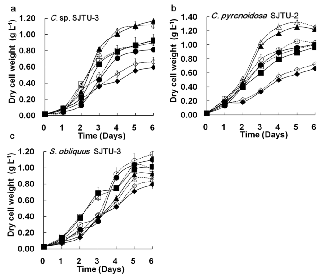 | Chlorella pyrenoidosa SJTU-2 | 0.440 | 0.329 | 0.465 | 0.692 | 0.436 | 0.584 | 1.230 | 0.345 | 0.467 | 0.704 | 0.302 | 0.354 |
