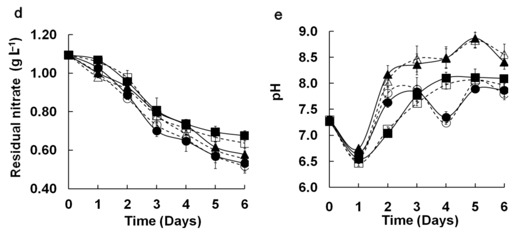 The presence of nitrogen, the type of nitrogen source, and a correct range of pH value are important factors for microalgae [18,19]. In microalgal cultivation, nitrogen source concentration and pH value are usually important variables owing to the nitrogen uptake and CO2 consumption by microalga growth. Therefore, by comparing these two parameters in M96SS and flasks under the same operating conditions, the agreement between the cultures in both systems can be further validated. The comparison of residual nitrate and pH in M96SS and flask cultures are shown in Figure 3(d,e). Residual nitrate decreased daily during cultivation. Medium pH sharply declined at day 2, possibly because the low biomass at the beginning of the culture could not fully utilize dissolved CO2. The major trend of pH variation increased with increasing biomass. The results of the t-test (p = 0.833, 0.989) and linear regression analysis [Figure 4(b,c)] showed good agreement between both systems for these two parameters (R2: 0.991, 0.974 at p < 0.0014, 0.0017, respectively). These results further confirmed the similarity of results for M96SS and traditional flask culture.