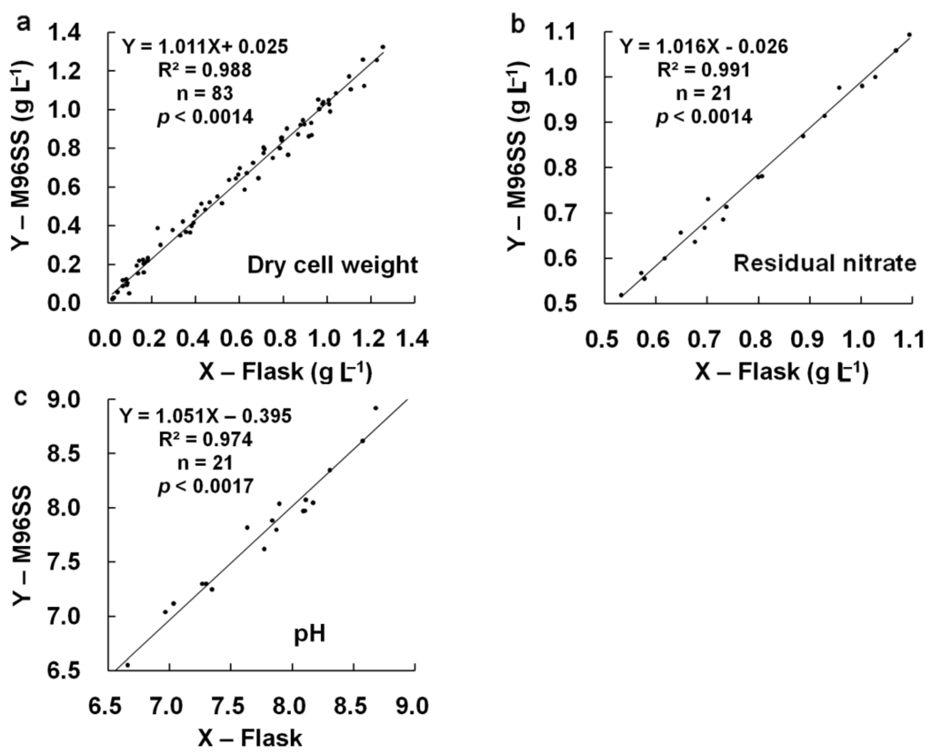 Linear regression analysis of cell growth, residual nitrate, and pH in M96SS versus flask culture.