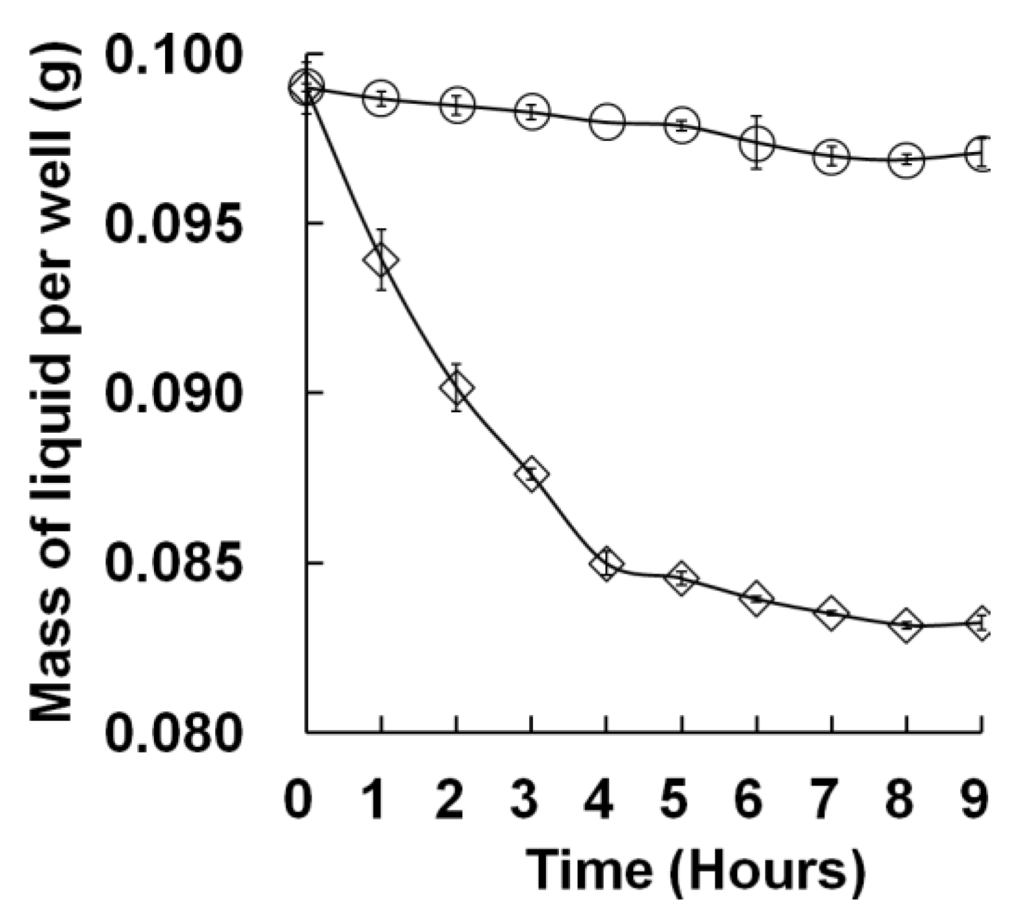 Eight microplates were loaded with cell-free medium (100 μL per well), and then sealed with Parafilm®. Four plates were fixed on a microplate shaker and shaken at 600 rpm (3 mm amplitude). The other 4 plates were fixed on the M96SS at 20 rpm (20 cm radius). The Parafilm® covers were removed hourly and the mass of intra-well liquid was weighed with an analytical balance.