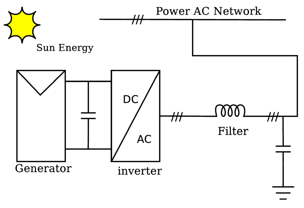 The plant under investigation consists of a PV generator directly coupled with a Voltage Source Inverter (VSI) as said in the introduction. A simplified scheme of the system is shown in Figure 1. The inverter is connected to the network or to the load through an intermediate LC filter to meet power quality grid requirements. If an output transformer is required, the filter can be made of the short circuit transformer impedance and by a capacity bank.