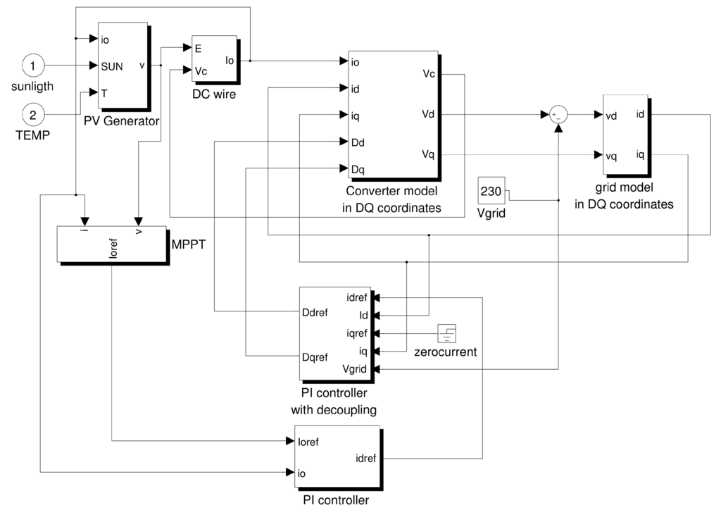 The control system requires the presence of a PLL (Phase Locked Loop) device both for synchronization and for giving effect to the decoupling of the D and Q control channels. This is usually a common issue for grid connected power PV systems.