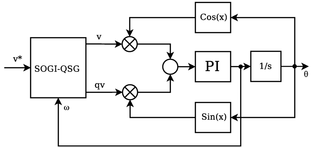 Quadrature signal based PLL with a SOGI-QSG system (qv is a quadrature signal with respect to v).