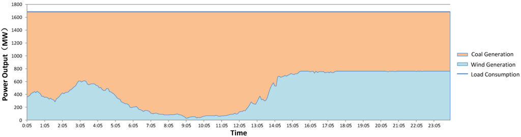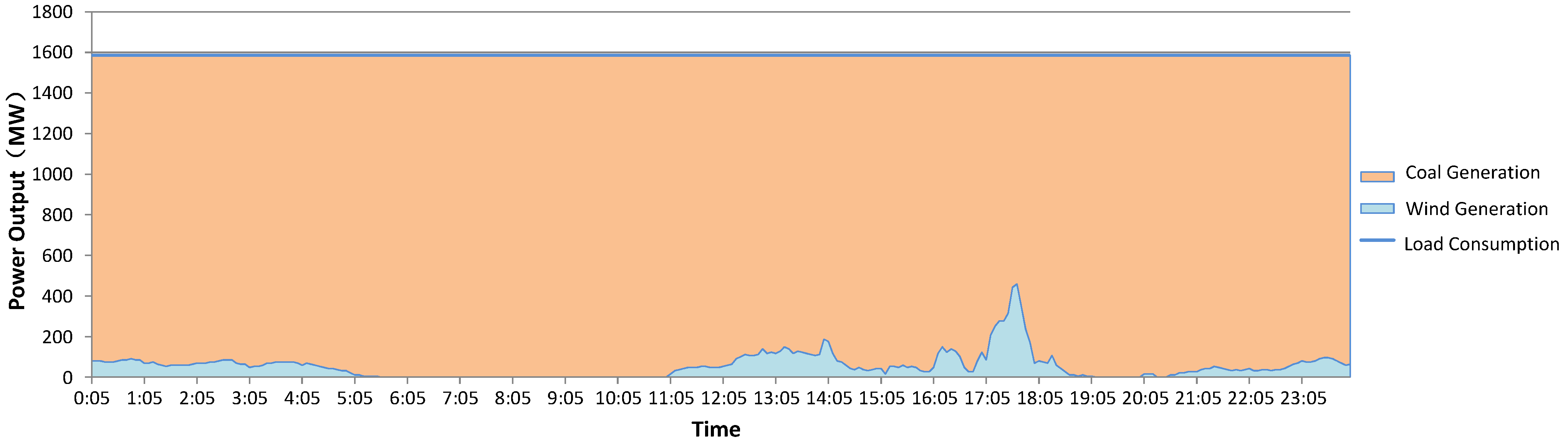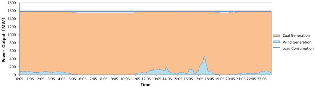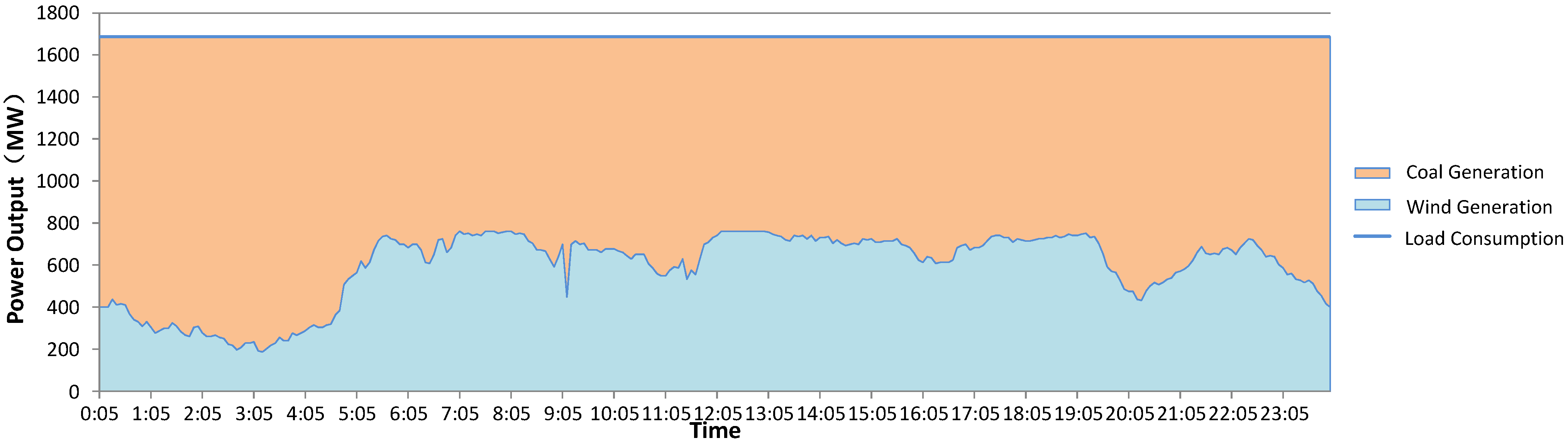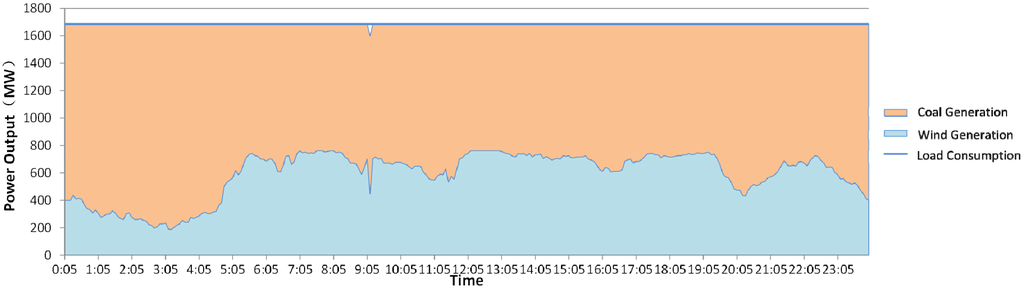 Figure 5 indicates that the wind-coal hybrid system is able to satisfy the load consumption of 1686 MW. However, since the total generation from wind and the minimum output of coal generators exceeds the total load, around 30 MW wind power should be curtailed in order to keep the system balanced as shown in