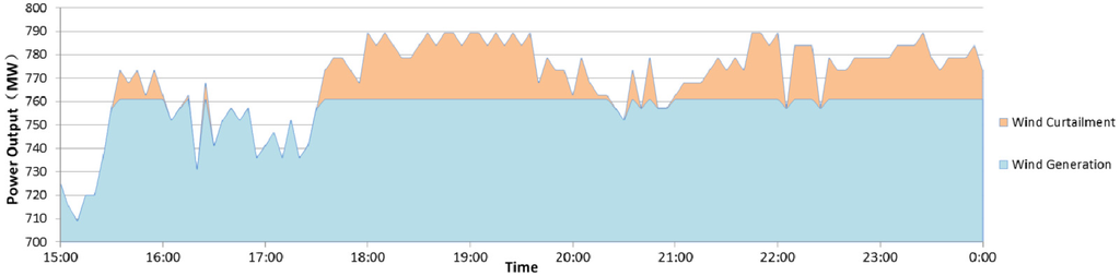 Figure 11 plots the wind power output on the day of 8 April 2008 and it shows that the highest power fluctuation, which is as fast as 283 MW/5 minutes, happens from 8:50 to 9:30. When the coal generators are all in service, the overall ramping rate is fast enough to compensate for the wind power fluctuation.
