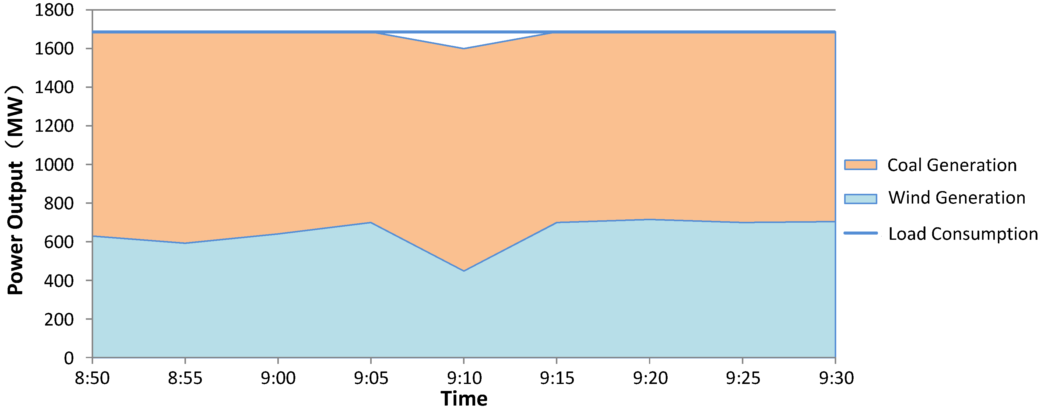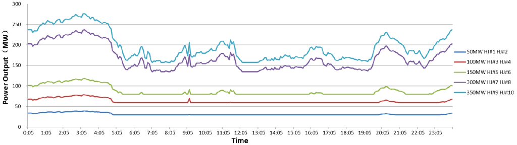 Figure 8 shows that the wind-coal generation is capable of supplying the electrolysis plant. Even though there is no wind output, the coal-powered generators can still meet the overall load demand when all the generators are in service. In practice, another common scenario is that one generator is out of service due to maintenance or some other reason. The most serious situation is that the largest generator, HJ#9 of 350 MW in this paper, goes out of service. The scenario is simulated and plotted in
