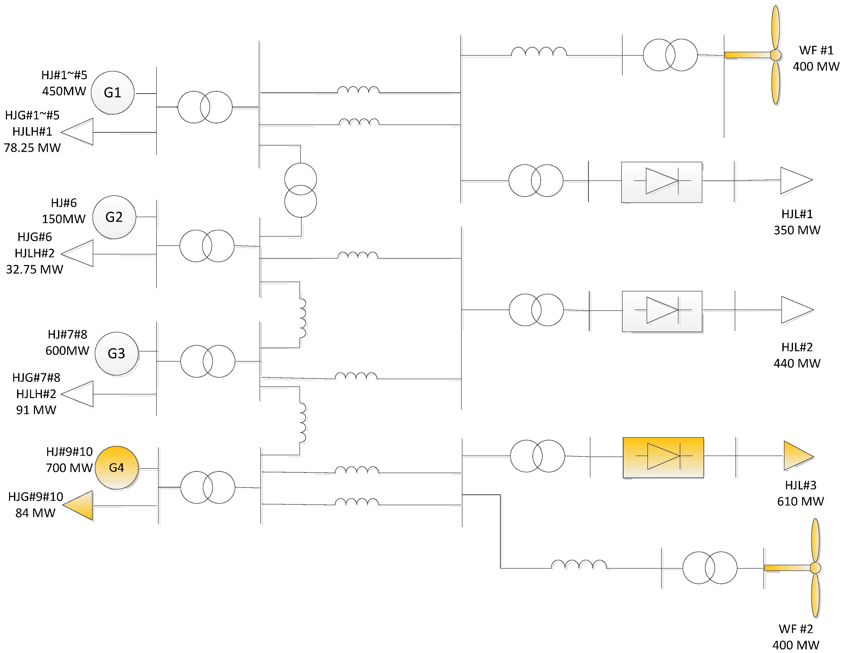 Load. The main load in this system is aluminum electrolysis load, 1400 MW in total. Among them, HJL#1 and HJL#2 have already been constructed and HJL#3 is a new electrolysis plant under construction. The electrolysis plants are driven by DC current so they are connected with the grid through a diode-rectifier. In addition to electrolytic DC load, there are also 100 MW AC heating load and a total of 186 MW auxiliary AC power for the coal-powered power plants. In terms of auxiliary power with respect to the total power plant capacity, the ratio is 8.5% for thermal-coal-fired plants and 12% for low-grade-coal-fired plants respectively.