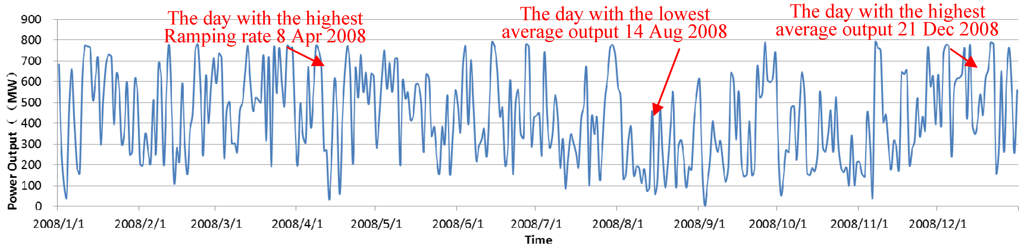 Figure 3 and three special days are subsequently selected for the examination of system balance. These days include the day with the highest average output of wind power, the day with the lowest average output of wind power and the day with the highest wind power ramping rate. The system capability of maintaining power balance can be evaluated based on the investigation of these extreme scenarios.