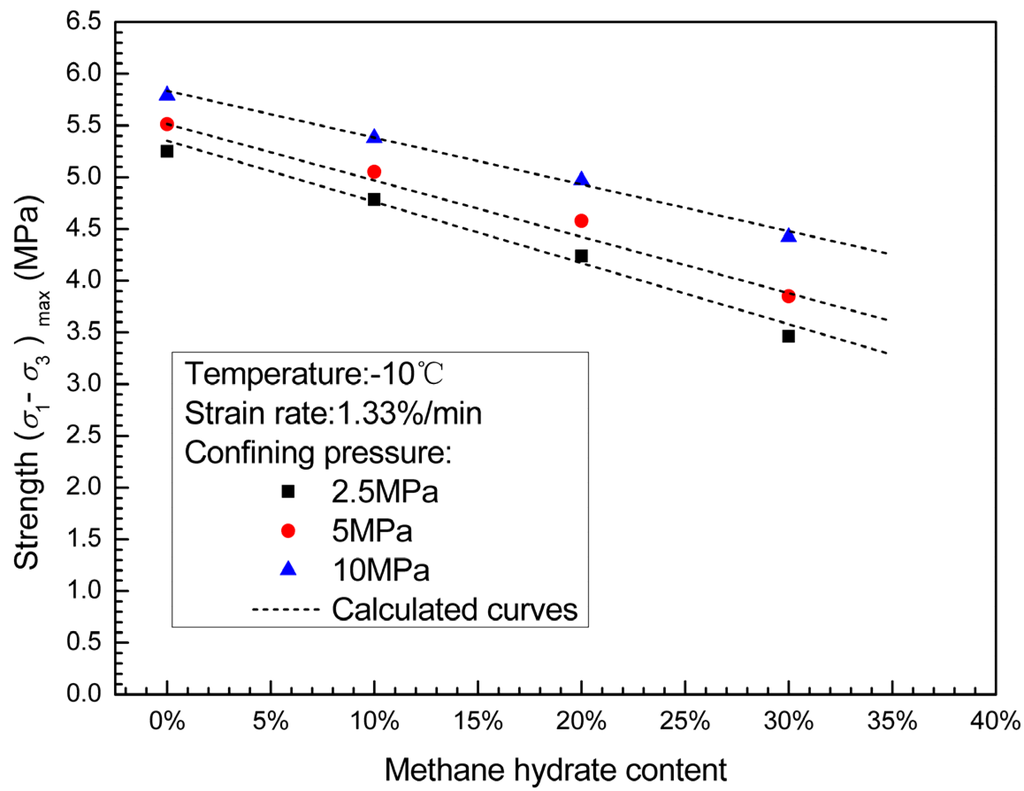 Figure 5 shows the strength and the dependency as a function of methane hydrate content under various confining pressures of 2.5 MPa, 5 MPa, and 10 MPa. The failure strength varies with methane hydrate content—the larger the methane hydrate content, the smaller the failure strength. Methane hydrate changes the cementing status between ice particles, and the cohesion between ice particles is larger than that between ice and methane hydrate particles. In the case of specimens with methane hydrate content of 0%, the failure strength rises from 5.25 MPa to 5.792 MPa as the confining pressure increases from 2.5 MPa to 10 MPa. The increment of failure strength is 0.512 MPa. In the case of specimen with methane hydrate contents of 10%, 20% and 30%, the increments of failure strength are 0.597 MPa, 0.73 MPa, and 0.961 MPa, respectively, indicating that confining pressure increasingly impacts failure strength of methane hydrate-ice mixture specimen with increasing methane hydrate content. It also means that the internal friction angle increases with increase of methane hydrate content; the friction force between ice particles is smaller than that between ice and methane hydrate particles.