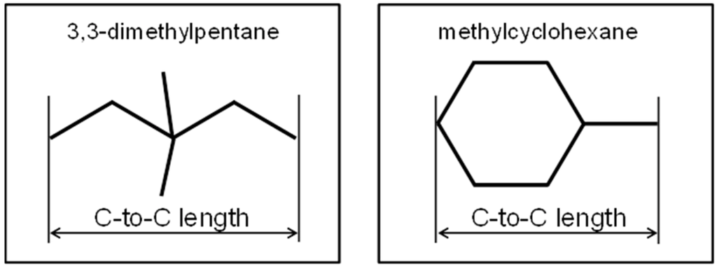 To study correlations between the molecular size and thermodynamic stability, we use equilibrium pressure data of structure-H hydrates formed with methane and 20 different LMGSs, as reported in previous studies [8,9,10,11,12,13,14,15] and calculated from interpolation of the data at 276 K. The calculations of different criteria for LMGSs molecular size were performed using the Gaussian03 program. These involved to first optimize the geometry of the LMGSs with the hybrid density functional B3LYP method and aug-cc-pVDZ basis sets, followed by a calculation of the molecular volume and the longest distance between two carbon atoms in a large molecule guest substance. The maximum length was defined as “C-to-C length”, as shown Figure 1.