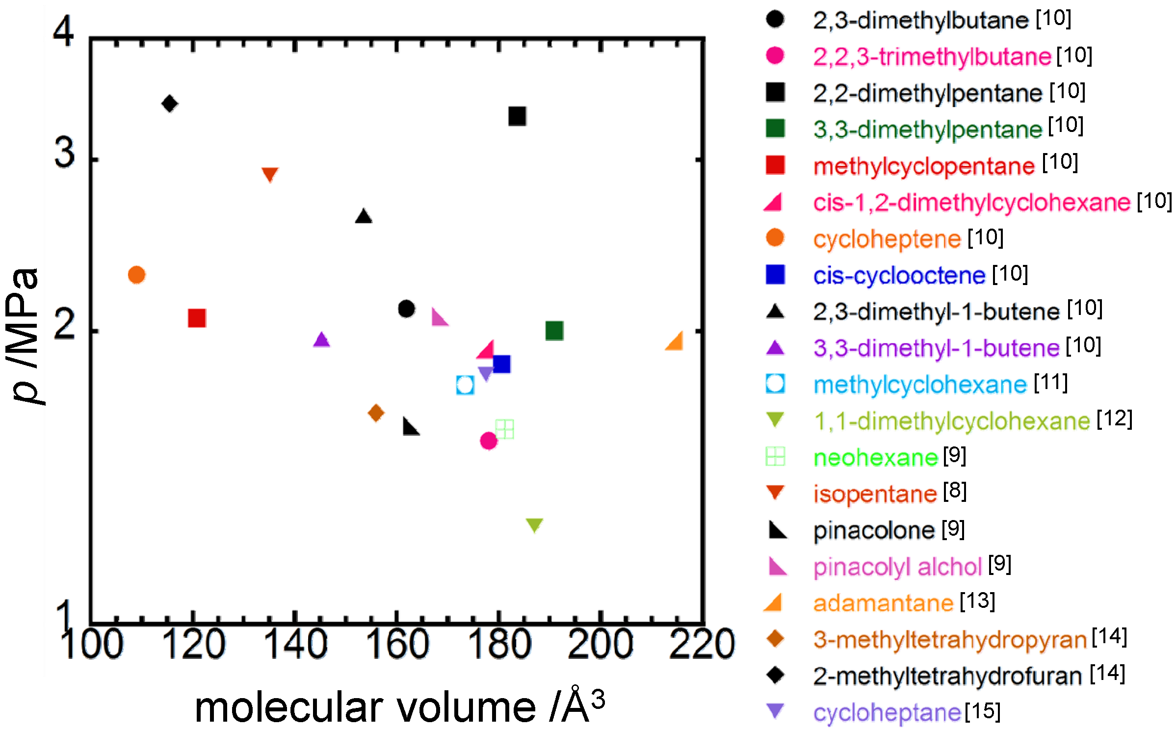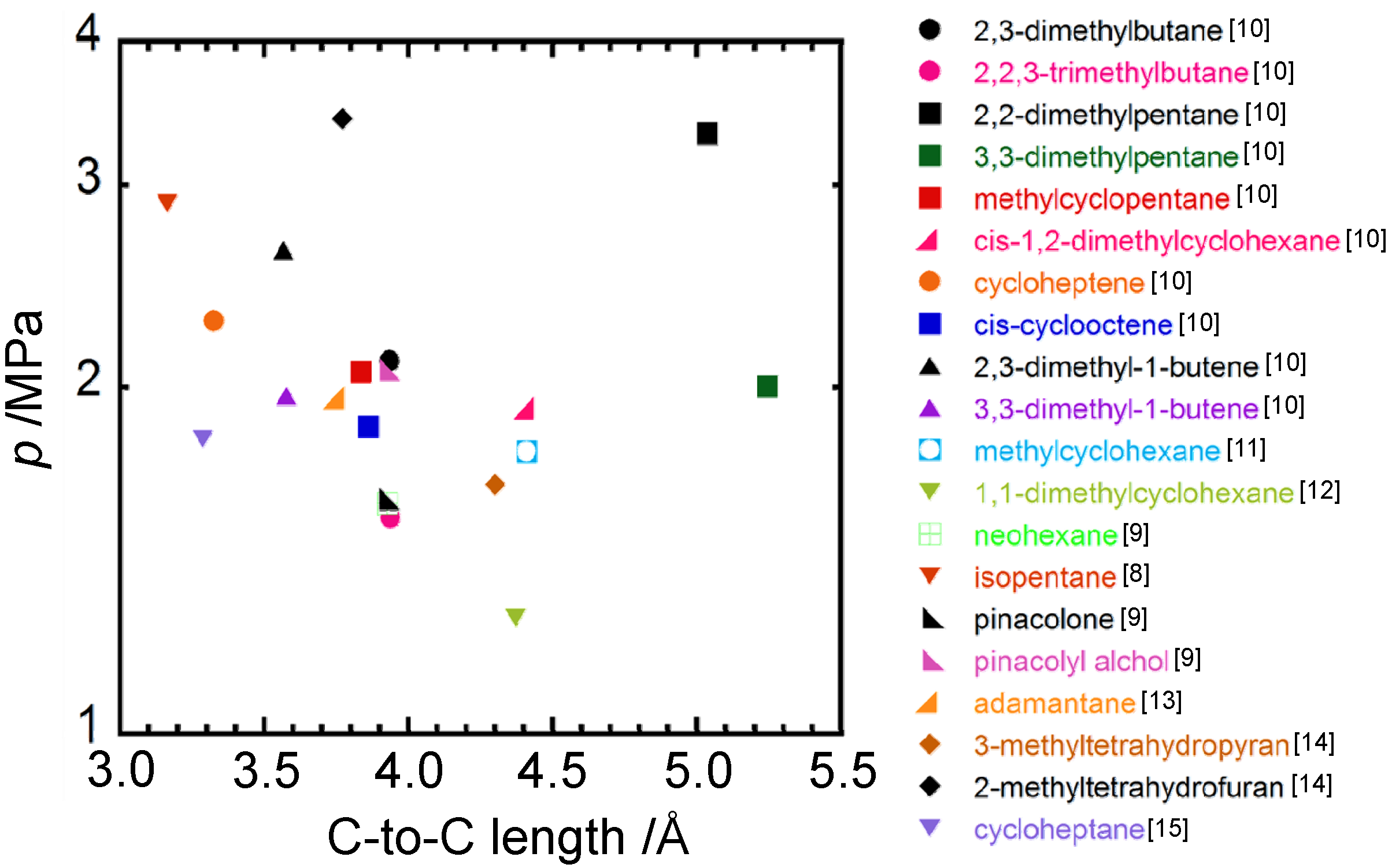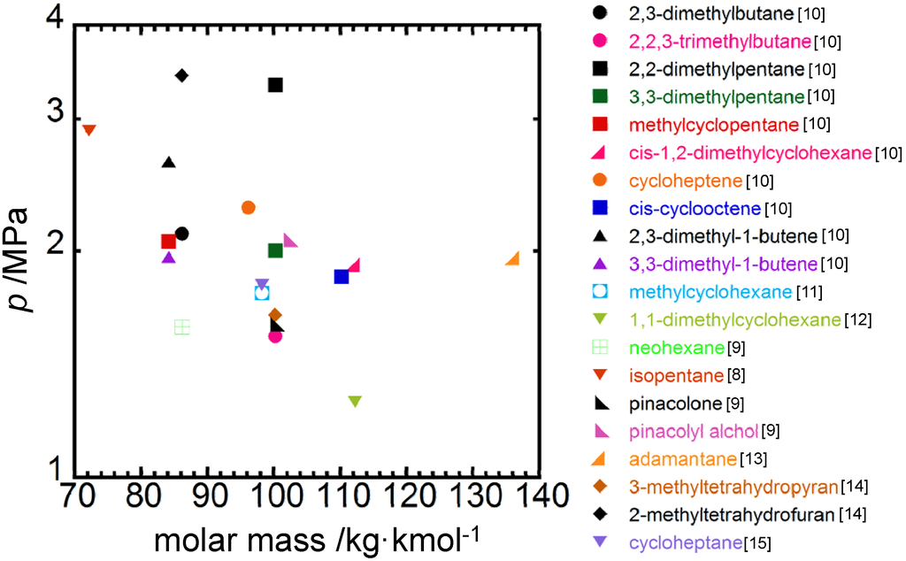 Also, changes in the functional group from carbonyl to hydroxyl, e.g., pinacolone and pinacolyl alcohol, have a considerable effect on equilibrium pressure, 1.6 MPa for pinacolone and 2.1 MPa for pinacolyl alcohol, while differing slightly in their molecular sizes, which are 3.9 Å of C-to-C length for both, and 162 Å3 of molecular volume for pinacolone and 168 Å3 for pinacolyl alcohol, and molar masses, which are 100.16 kg/kmol for pinacolone and 102.18 kg/kmol for pinacolyl alcohol, as shown in Figure 2, Figure 3 and Figure 4.