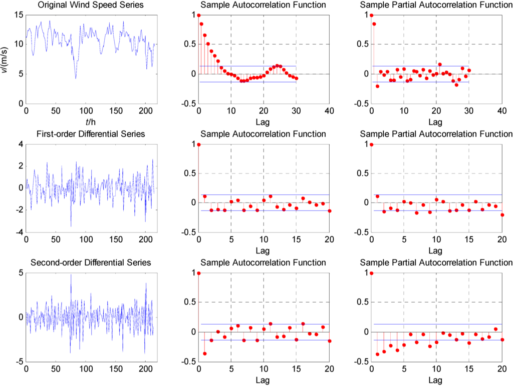 First, a run-length test is conducted to examine the stationarity of the original time series. The method involves field data only. A hypothesis for data distribution regularity is not necessary, which proves to be practical. Results of the run-length test clearly show that the original sequence is shifting. After the first-order and second-order differential evolutions, reexaminations prove the stationarity of the modified first-order differential evolution sequence. Therefore, the first-order differentiation method is adopted for calculation. The original wind speed time series and its autocorrelation function and partial correlation function are shown in Figure 1. The curves in the second line reveal that the autocorrelation function of the first-order differentiation sequence rapidly attenuates to zero, which further proves that the first-order differentiation sequence is stationary.