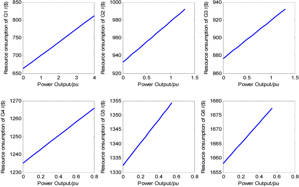 Figure 6 shows that the resource consumption values of the six generators increase monotonously with the escalation of power output level. The operational cost of thermal unit is determined by resource consumption. This characteristic leads to the active power of all thermal generator units in different dispatching periods close to the relevant power output value of the minor resource consumption when using the objective function of minimum operational cost in optimal dispatching. Besides, those with minor resource consumption in the same load distribution have the priority to take the load. Nevertheless, the energy-environmental efficiency curve and the resource consumption curve show different characteristics.