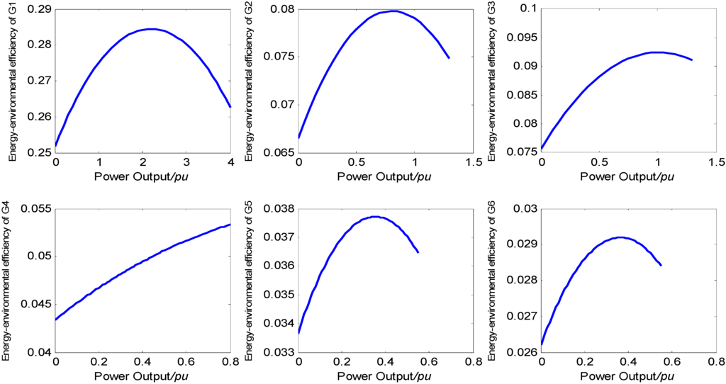 Figure 7 shows the energy-environmental efficiency values of the six generators under different power output levels. The energy-environmental efficiency of the thermal generators does not monotonically increase along with the escalation of the power output, except in the fourth unit. They generally have parabolic curves that make energy-environmental efficiency values lower on both light and heavy power output levels. This characteristic significantly influences the load dispatch strategy when considering energy-environmental efficiency. For a certain generator, power output in different dispatch periods converges to the point where the energy-environmental efficiency reaches its optimum value. For generators with the same power output character, those with better energy-environmental efficiency have the priority to take the load.