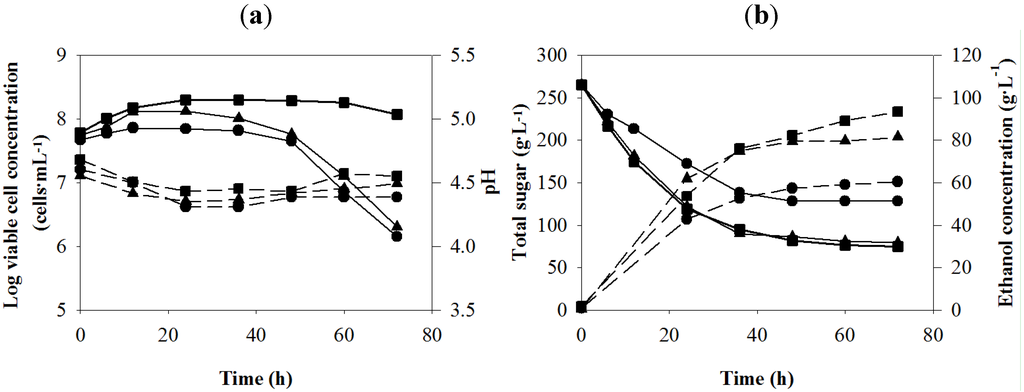 ) °C. (a) log viable cell (solid lines), pH (dashed lines) and (b) total sugar (solid lines), ethanol concentration (dashed lines).