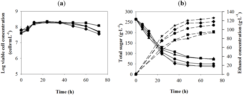 It is well-known that fermentation temperature has a significant effect on ethanol production efficiency and the degree of the impact depends on many factors including yeast strain and substrate concentration [38,39]. In industry, fuel ethanol fermentation under normal gravity condition is normally conducted at the fermentation temperature of 30 to 35 °C [39]. The effects of temperature on ethanol fermentation by S. cerevisiae NP 01 under the VHG conditions revealed that no lag phase was observed after the yeast cells were inoculated into the EP medium at all temperatures (Figure 1a). The initial pH values of the juice were 4.56 to 4.68. The pH at all temperatures slightly changed during the fermentation with a range of 4.31 to 4.57. At 30 °C, the cell concentration increased in 24 h, and it was relatively constant until the end of the experiment with the value of 2.22 × 108 cells·mL−1. On the other hand, at 35 °C the cell numbers increased in 12 h and decreased rapidly after 36 h. At 38 °C, the cell numbers slightly increased in 12 h and the value markedly decreased after 48 h as found at 35 °C. The viable cell numbers remaining at 30, 35 and 38 °C were 1.28 × 108, 2.60 × 106 and 1.50 × 106 cells·mL−1, respectively. The results strongly indicated that high temperature had a negative effect on yeast cell viability. Walker [23] reported that thermal damaged yeast cells by denaturation the hydrogen bonding and hydrophobic interaction resulting in the decline of yeast cell viability. Şener et al. [18] suggested that at the temperature higher than 20 °C, yeast cells experienced a rapid decline in viability at the end of fermentation and high temperature might disrupt enzyme activity and membrane functions. However, in our experiments, the decline of cell number was rarely observed at 30 °C. The different results might be due to the difference in yeast strain and fermentation medium.