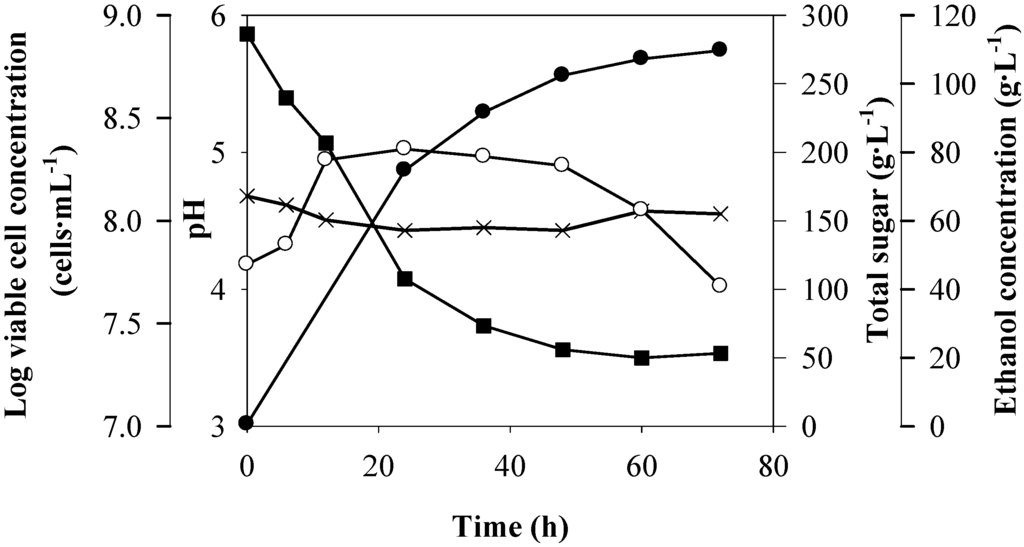 However, under appropriate environmental and nutritional conditions, Saccharomyces cerevisiae can produce and tolerate high ethanol concentrations [9]. The yeast is well-known as the main ethanol-producing microorganism used in industrial processes [10]. Minteer [11] reported that yeast withstood extreme environmental stresses, including high osmolality (beginning soluble solids of 25 to 30% w/v) and high ethanol concentrations (12 to 18%, v/v), as well as organic acids produced by contaminating bacteria. Our previous work found that among three high-ethanol-producing strains of S. cerevisiae (TISTR 5048, TISTR 5339 and NP 01), NP 01 gave the maximum ethanol concentration under batch fermentation in an ethanol production medium containing 280 g·L−1 of glucose [12].