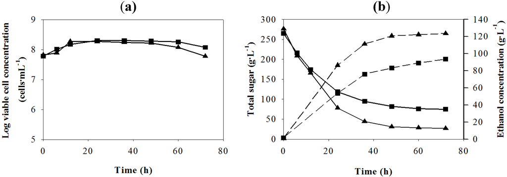 ) from the sweet sorghum juice; (a) log viable cell and (b) total sugar (solid lines), ethanol concentration (dashed lines).