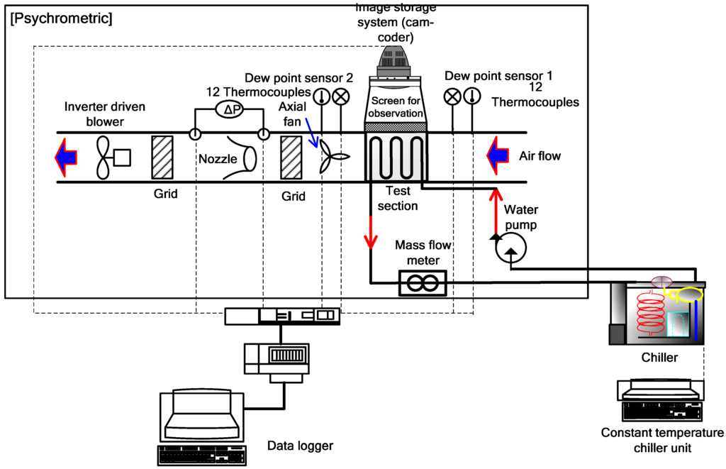 A schematic of the experimental setup used to measure frost height during frost growth on the tested heat exchangers is shown in Figure 1. The test equipments were installed in a psychrometric chamber to provide a pre-controlled ambient temperature. The psychrometric chamber was maintained at 5.0 °C using an air-handling unit including a cooling coil, a heating coil, and a humidifier. The air temperature entering the test section was adjusted by using an electric resistance heater installed at the entrance of the flow chamber. The humidity was maintained at a set point by adjusting the power input to an ultrasonic humidifier. For measurement convenience, an ethylene glycol-water mixture was utilized as a refrigerant which passed through aluminum tubes. The temperature of the ethylene glycol-water mixture was constantly controlled properly by a constant temperature bath including a chiller and an electric heater. Air temperatures of test coils at the inlet and outlet were measured by arithmetically averaging the values obtained with twelve thermocouples installed in a uniform grid at each location. Frost layer surface temperature during frost growth was measured using an infrared thermometer with an accuracy of ±0.5 °C. Frost height was measured using a high performance digital cam-coder and a micro-scale measurement device with an accuracy of ±0.001 mm. The thermocouples were calibrated to an accuracy of ±0.1 °C. The absolute humidity was measured using a chilled mirror dew point sensor with an accuracy of ±0.2 °C. The air flow rate was measured using a nozzle in an open wind tunnel to an estimated accuracy of ±2.0%. The pressure drop across the tested heat exchanger was measured using a differential pressure transducer with an accuracy of ±1.0%. The refrigerant flow rate was measured using a Coriolis effect flow meter with an uncertainty of ±0.2% of the reading.