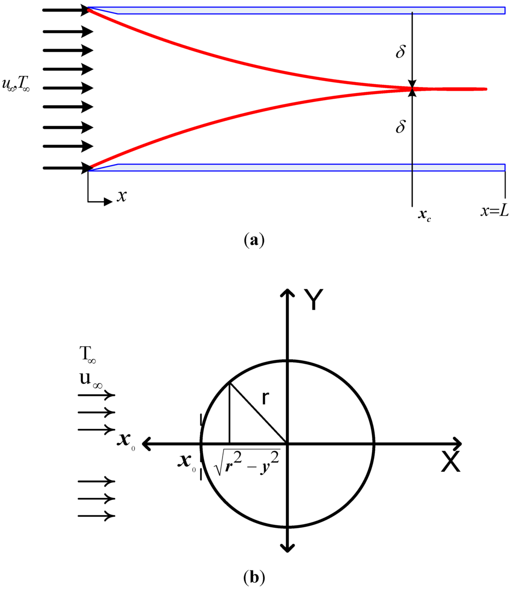 Figure 3(a) shows the schematic of the boundary layer between the round plate fins. Boundary layer interruption between the fins should be considered because it caused the heat transfer coefficient to significantly decrease. To enhance the heat transfer coefficient of the tested heat exchanger, the boundary layer interruption between the fins should be prevented and the developed boundary layer along the fins between the tubes should be broken as mentioned by Lee [22]. Also, the boundary layer thickness increases with the increase of the plate length, resulting in the decrease of the heat transfer coefficient as mentioned by Kim and Kim [23]. Leading edge of the boundary layer formation in the round plate fin was changed along the contour of the round plate fin as shown in Figure 3(b). The boundary layer length and thickness was changed with the contour shape of the round plate fin as given in Equation (2). Lx,crit, which is the distance after occurrence of the boundary layer interruption between the fins, in Equation (3) was the position of a fully developed boundary layer, or the distance from the leading edge at which transition begins. Lx,c is the occurrence point of the boundary layer interruption between the fins.