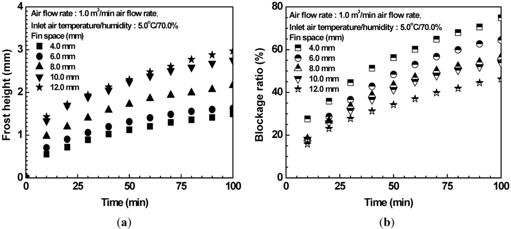 Figure 4(a) shows frost height as the fin space is varied from 4.0 mm to 12.0 mm at an inlet air temperature of 5.0 °C, relative humidity of 70.0%, air flow rate of 1.0 m3/min and refrigerant temperature of −15.0 °C. Frost height for the 8.0 mm fin space showed a similar rate of increase during the first step of 10 minutes because boundary layer interruption theoretically did not occur at over 7.0 mm of fin space during the tests. As frost continued to grow over 25.0 minutes, frost growth rate in each fin space differed because of the boundary layer interruption by frost growth. Frost growth rate for the 8.0 mm fin space was lower compared with other fin spaces because the boundary layer interruption occurred at the beginning of frost formation. Theoretically, frost growth rate was affected by the fin space as mentioned by Mon and Gross [24]. However, frost height in the case of the larger fin space of 10.0 mm was less affected by the fin space because the boundary layer interruption was delayed. Figure 4(b) shows the blockage ratio with the variation of the fin space. Frost blockage ratio was defined as Equation (3), suggested by Lee et al [25]. Frost blockage ratio between the fins was defined as the rate of decrease of the air flow path due to the increase in frost height with time. Frost blockage ratio increased with decreasing fin space. Therefore, knowledge of frost blockage ratio would be an important reference for the design of an advanced heat exchanger to operate under cold weather conditions. Frost blockage ratio decreased on average by 26.1% with the rise of the fin space from 6.0 mm to 12.0 mm. Therefore the design of the fin space in a heat exchanger is a key parameter when considering the operation time under frosting conditions. In addition, the blocking of the air flow area at smaller fin pitches was more accelerated with frost growth.