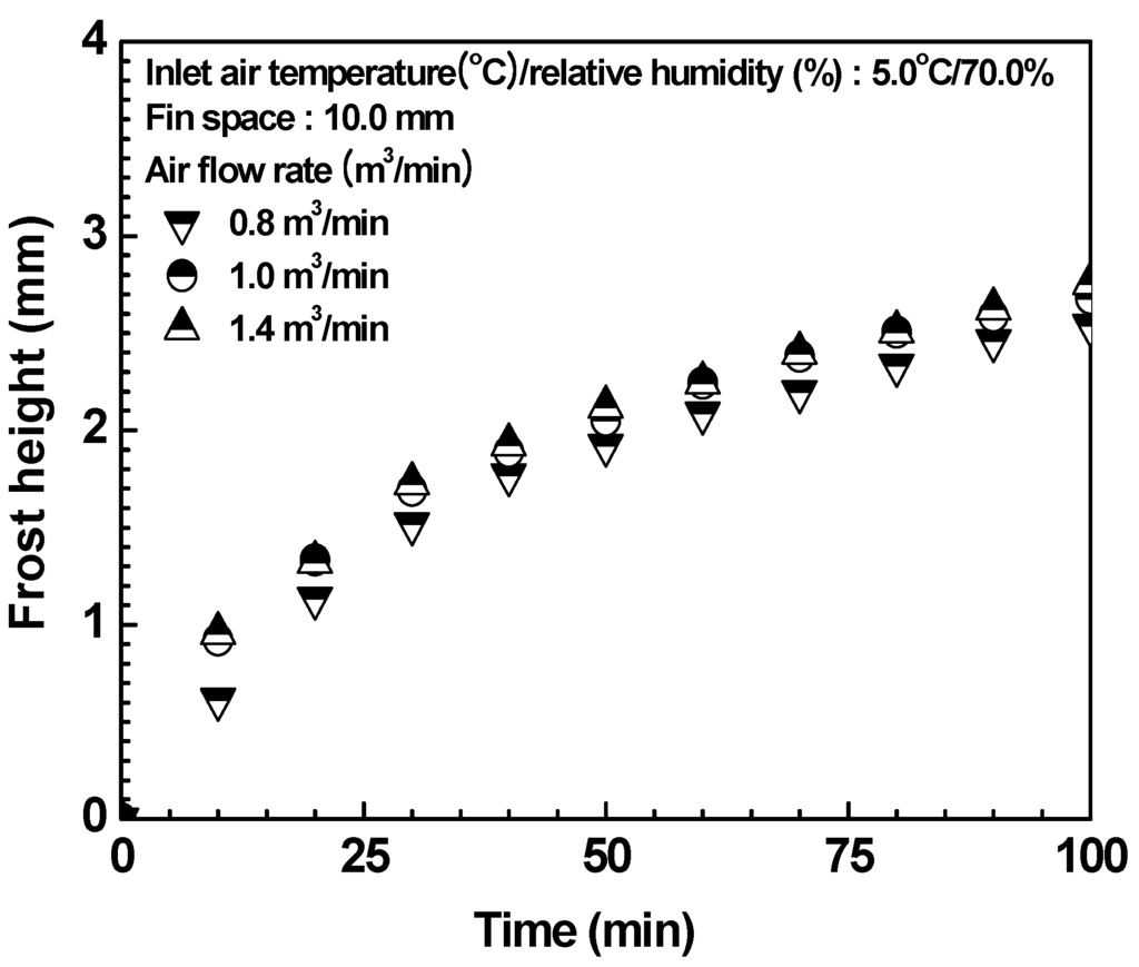 (ii) Frost height increased by approximately 91.9% with an increase of relative humidity from 50.0% to 80.0%. Frost height increased by approximately 13.0% with an increase of the air flow rate from 0.8 m3/min to 1.2 m3/min.