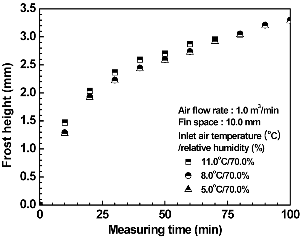 Figure 7 shows frost height with variations of the inlet air temperature at fin space of 10.0 mm, refrigerant temperature of −15.0 °C, and air flow rate of 1.0 m3/min. Frost height at an inlet air temperature of 11.0 °C was 38.5% greater than that at the inlet air temperature of 5.0 °C. However frost height at inlet air temperature of 11.0 °C was 4.5% greater than that of the inlet air temperature of 8.0 °C. This is because the humidity ratio increased with the increase of the inlet air temperature under same relative humidity but the increasing rate of humidity ratio decreased with the inlet air temperature increases. The increasing rate of the humidity ratio at inlet air temperatures from 5.0 °C to 11.0 °C and from 8.0 °C to 11.0 °C were 125.0% and 50.0%, respectively. Finally, major parameters affected by frost height were the fin space, relative humidity, inlet air temperature, and air flow rate in a row. These trends appeared in the results of Lee et al. [27]. Moreover, the fin space was critically related to the boundary layer interruption with frost growth and air flow rate reduction with time. In order to develop a more precise frost growth model, the boundary layer interruption between fins should be considered to predict frost density with frost growth.