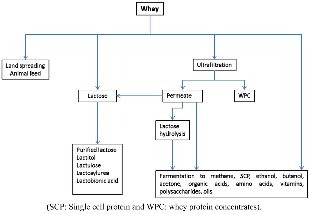 According to Mawson [13], the different ways of disposal or use of CW could be divided into three main categories: (1) Direct use or disposal, where the CW is used with very little or no further processing. This category includes the traditional use of CW as animal feed and the direct use of the whole or deproteinated CW as a component of food or drinks; (2) Direct stabilization, where the CW is treated by physical or chemical ways in order to make it more stable towards microbial degradation. The techniques used include: protein recovery with ultrafiltration or heat denaturizing, concentration by reverse osmosis and/or with evaporation, crystallization or drying of lactose; (3) Conversion processes, where the lactose is converted into other compounds through the activity of microorganisms (biotransformation) or through chemical reactions.