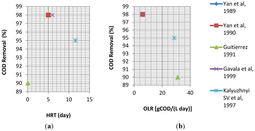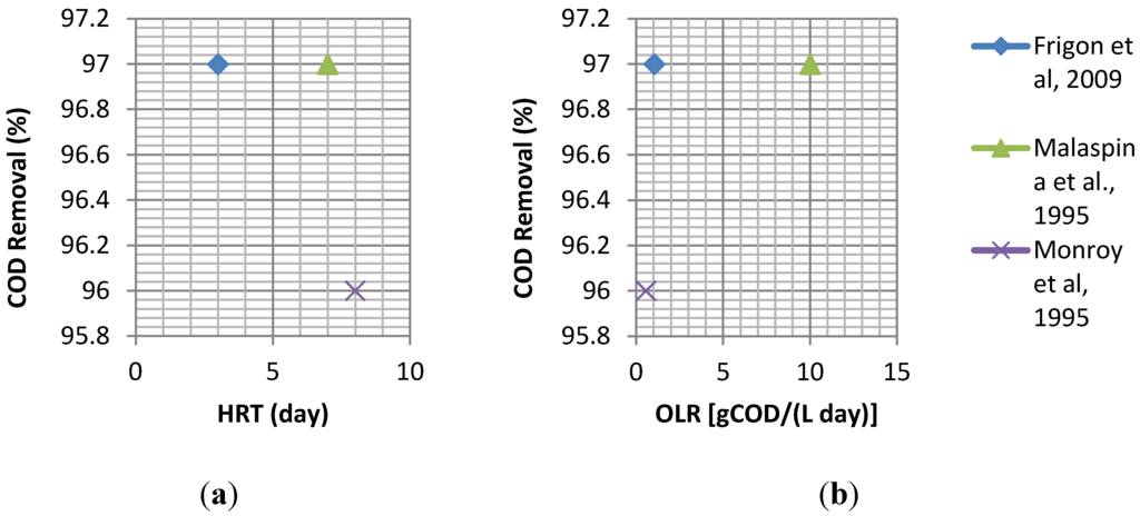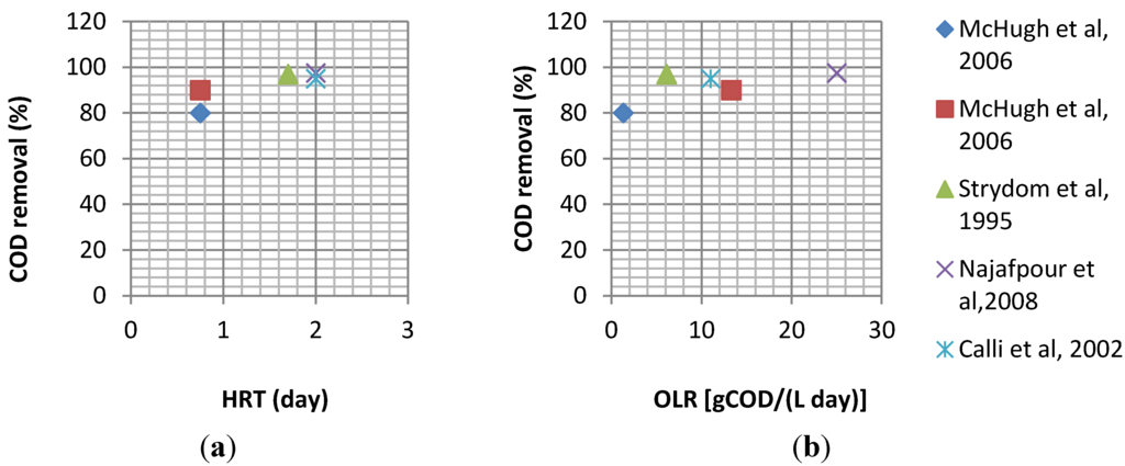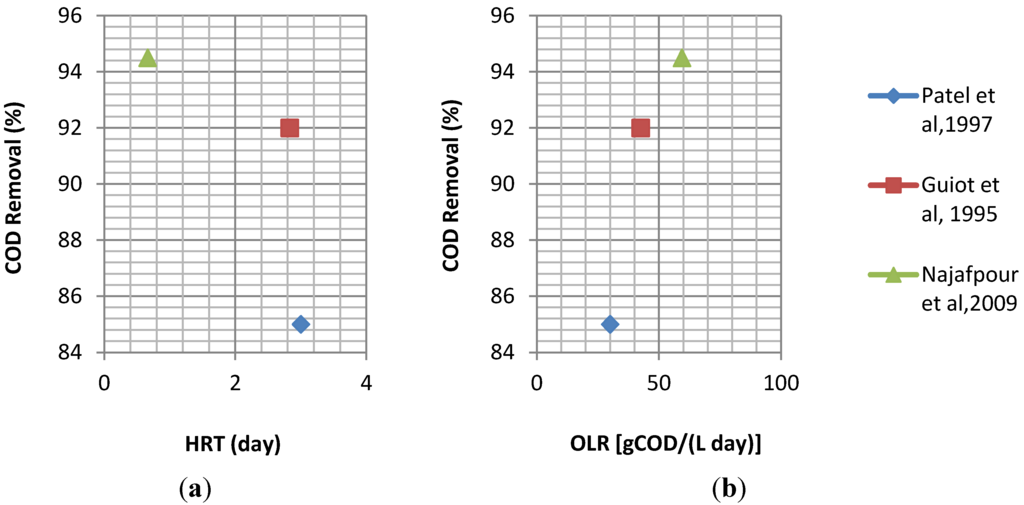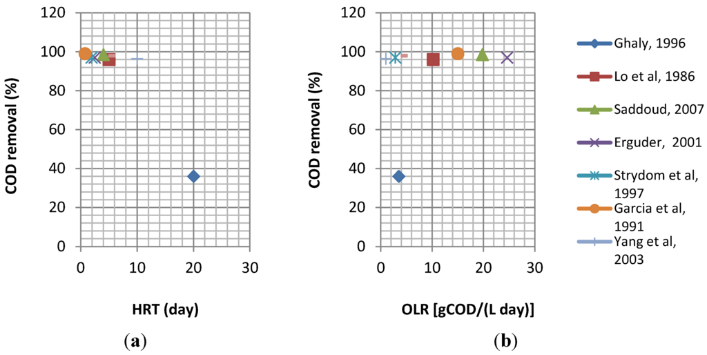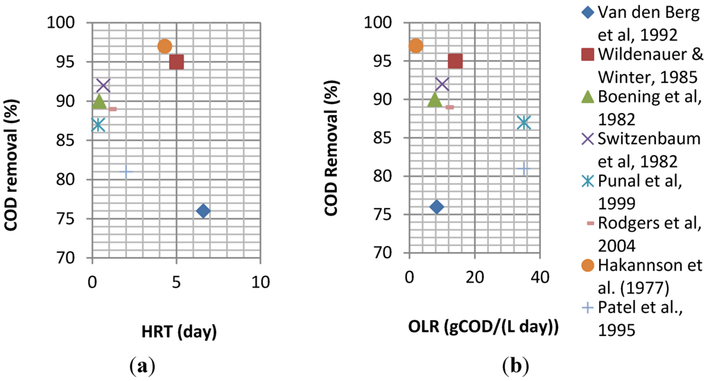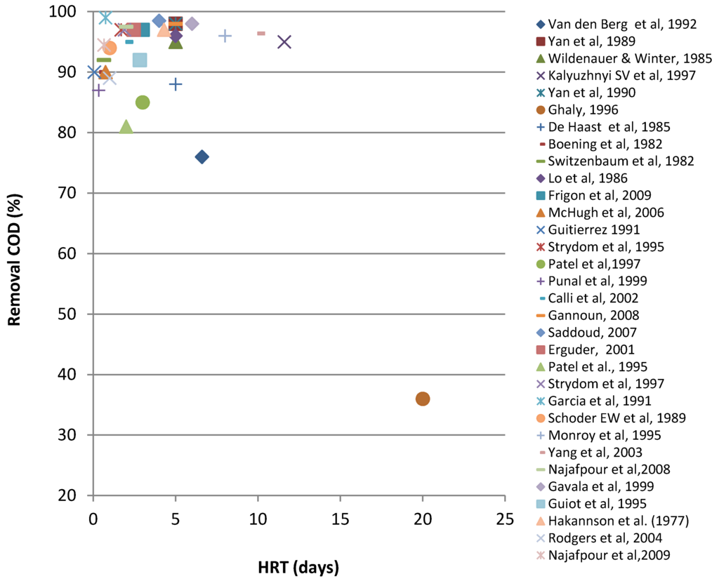 From Figure 2 it becomes clear that it is quite difficult to assess the effectiveness of the used systems, at least with respect to the superiority of any particular technology. Various types of reactors have been used, ranging from simple to more complex types such as UASB (for more details see [19]). In general, it is difficult to compare systems operated in different laboratories, not only because of the possible differences in the anaerobic sludge characteristics [4], but also because of the differences in operating parameters (such as temperature, pH, OLR, total solids and volatile fatty acids content, toxicity, HRT, inoculums type) and the composition of the AD effluent.