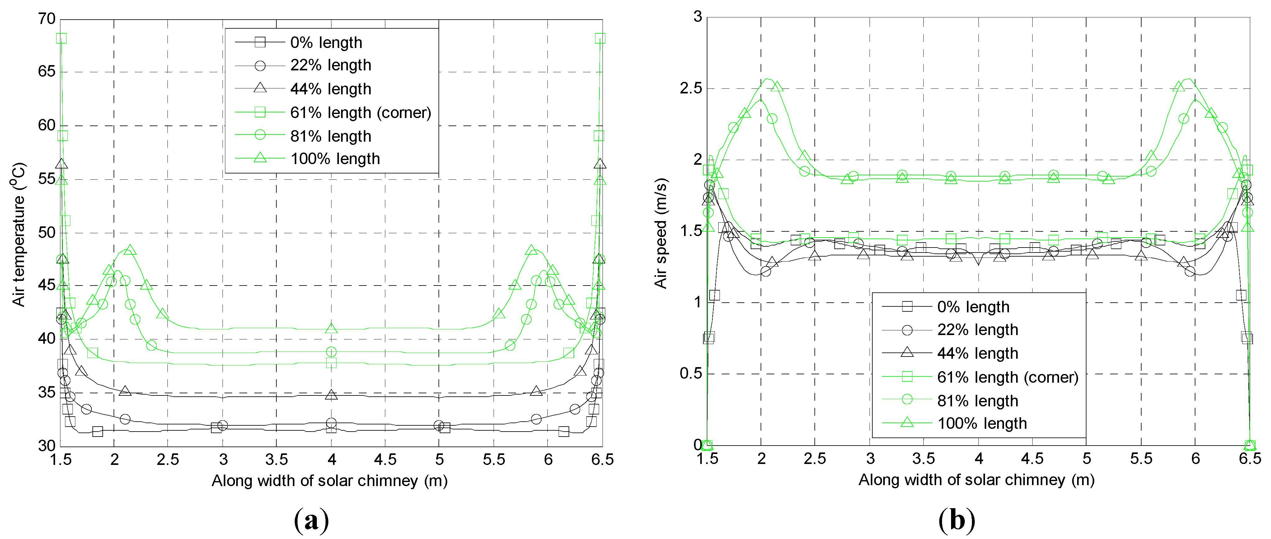 (a) Air temperatures along solar chimney’s width for various mid-length of solar chimney for base case simulation; (b) Air speeds along solar chimney’s width for various mid-length of solar chimney for base case simulation.