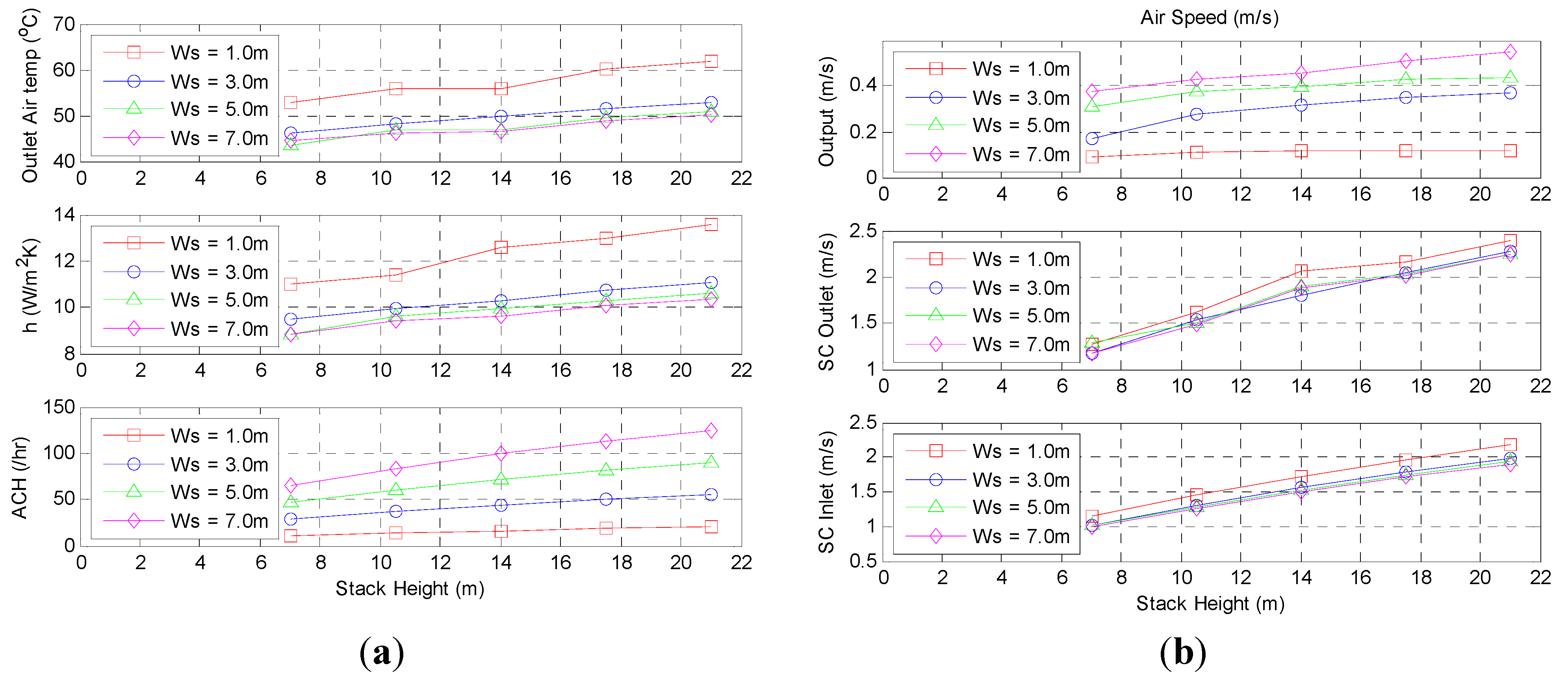 (a) Solar chimney outlet air temperatures, heat transfer coefficients and air change rates with respect to varying solar chimney’s width; (b) Output air speeds, solar chimney outlet air speeds and solar chimney inlet air speeds with respect to varying solar chimney’s width.