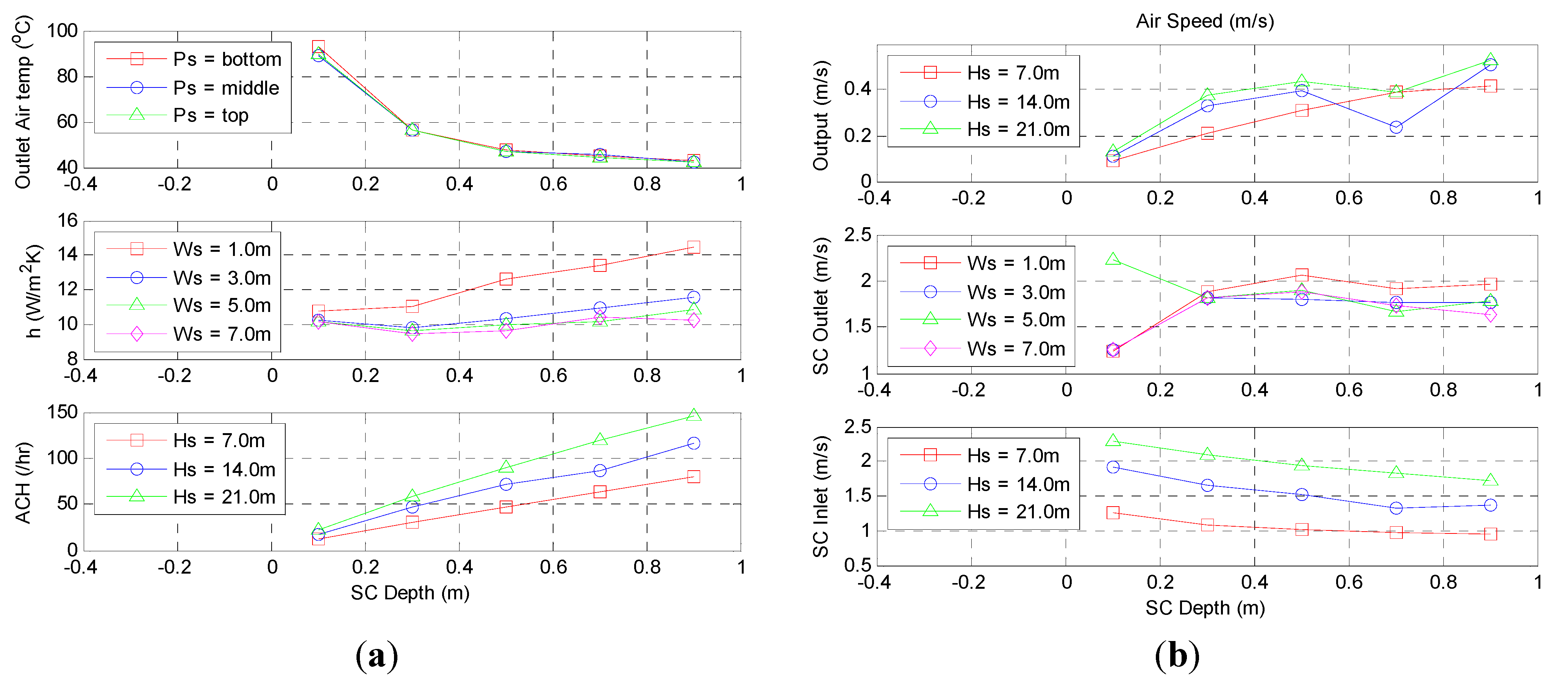 (a) Solar Chimney outlet air temperatures, heat transfer coefficients and air change rates with respect to varying solar chimney’s depth. (b) Output air speeds, solar chimney outlet air speeds and solar chimney inlet air speeds with respect to varying solar chimney’s depth.
