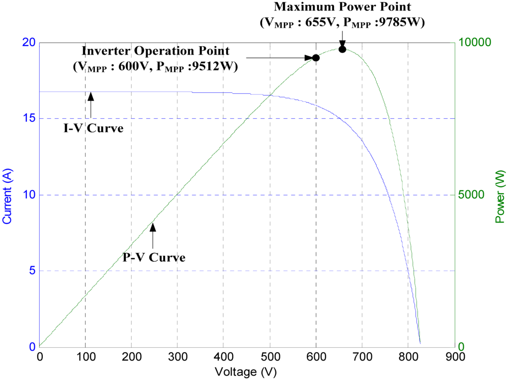 If the MPP voltage of PV cells is 655 V in the curve of Figure 7 and the DC-link reference voltage is 600 V, the boost converter does not operate and the voltage of the PV cells is maintained at 600 V. This result is shown in Figure 7 and Figure 8. Although the PV cells maximum power is set to 9785 W, the power from the PV cells is 9512W because the inverter controls the DC-link voltage to be 600 V. Also the duty-cycle of the boost converter is zero. It means that the boost converter is not operating. The power loss is 233 W (i.e., 9785–9552 W) due to the tracking limitation. As the MPP voltage is increased, the power loss is larger.