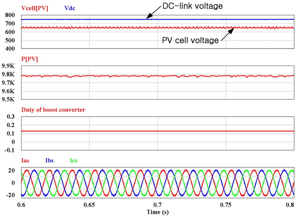 The maximum power is transferred by setting the DC-link reference voltage to be larger than the MPP voltage of PV cells. Figure 9 shows these results. The DC-link voltage is 750 V, and the PV cells voltage is 655 V like the MPP voltage. The duty of boost converter is not zero because the MPPT algorithm is performed by the boost converter. In contrast with the result of Figure 8, the power from the PV cells is increased to 9785 W which is the PV cells’ maximum power. Therefore, we propose a DC-link voltage control method that is based on the input voltage.