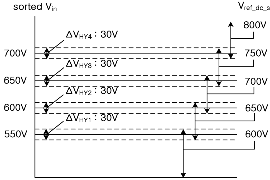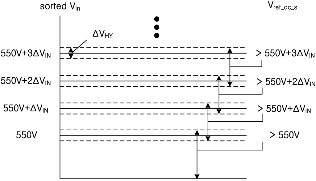 Figure 10 shows a basic concept of the proposed algorithm. The performance characteristics and THD of the output current are determined by the selection of ΔVIN and ΔVHY. THD will be unnecessarily increased if ΔVIN is too large; therefore, a relatively small value has to be chosen for ΔVIN by considering the sensing noise. This noise causes frequent changes in the DC-link voltage reference. Moreover, ΔVIN should be larger than the variation of the DC-link voltage.