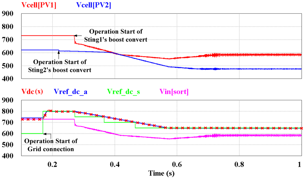 Figure 12 illustrates the performance of the proposed algorithm when the PV system is initiated. The temperature of PV1 is set as the lower value than that of PV2. The initial DC-link reference voltage is 600 V, but is then set to 800 V in accordance with Figure 11 because the sorted voltage is 730 V (the input voltage of PV1 is 730 V). The input voltage decreases when the boost convert starts operating. The decrease in the input voltage changes the DC-link reference. The selected DC-link voltage and the actual DC-link reference voltage with the 500 V/s ramp response is changed according to Figure 11.