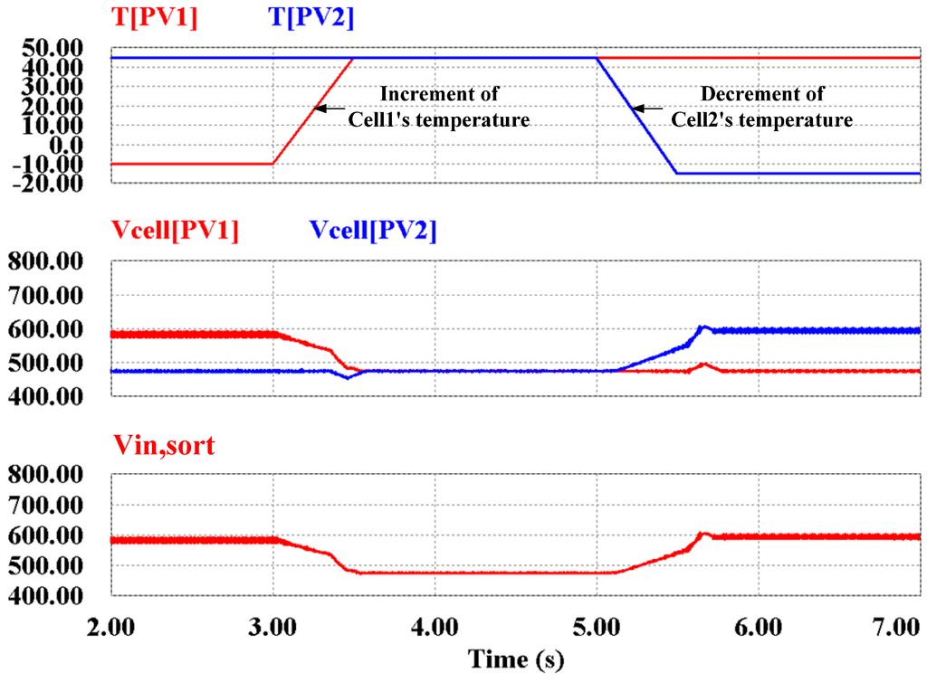 The proposed algorithm has been simulated using PSIM. The simulation circuit is as shown in Figure 1. The circuit parameters are chosen for a 10 kW system. The input inductances of the boost converters are 1.5 mH, the capacitance of DC-link capacitor is 1100 µF, and the inductance and capacitance of LC-filter parameters are 2 mH and 4.7 µF. The switching frequency for both the boost converter and the inverter is 20 kHz. The three-phase grid uses a 380 V line-to-line voltage. The ωn value for the DC-link voltage controller is 300 rad/s, and 500 V/s is used as the ramp response of the DC-link reference voltage. The period of the MPPT algorithm calculation is 0.05 s and Δduty-cycle is 0.005. The temperature of the PV cells is increased or decreased in order to characterize the performance of the algorithm.