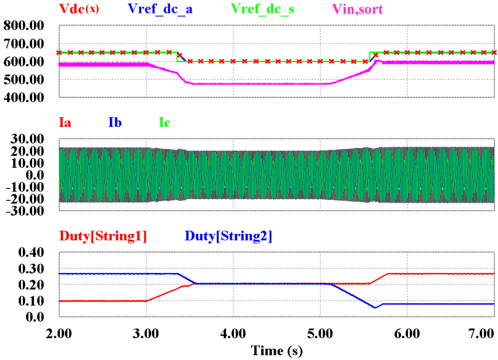 Figure 14 and Figure 15 show the system’s performance when the temperature of PV1 is increased from −10 °C to 45 °C for 0.5 s and the temperature of PV2 is decreased from 45 °C to −15 °C for 0.5 s. The input voltage of PV1 decreases owing to the increase in the temperature, and the sorted voltage is chosen as the voltage of PV1. At this point, the MPPT algorithm of the string 1’s boost converter increases the duty-cycle to find MPP. In addition, the DC-link reference voltage decreases to 600 V when the sorted voltage decreases below the minimum of ΔVHY3. Therefore the magnitude of the grid current is decreased because the PV’s temperature increase reduces its maximum power. Similarly, the input voltage of PV2 increases owing to the decrease in temperature, and the sorted voltage becomes the input voltage of PV2. Thus the DC-link reference voltage is selected according to the voltage of PV2. The DC-link reference voltage changes to 650 V when the sorted voltage increases above the maximum of ΔVHY3. In addition, the duty-cycle of the MPPT algorithm for string 2’s boost converter is decreased to determine MPP and the grid current is increased.
