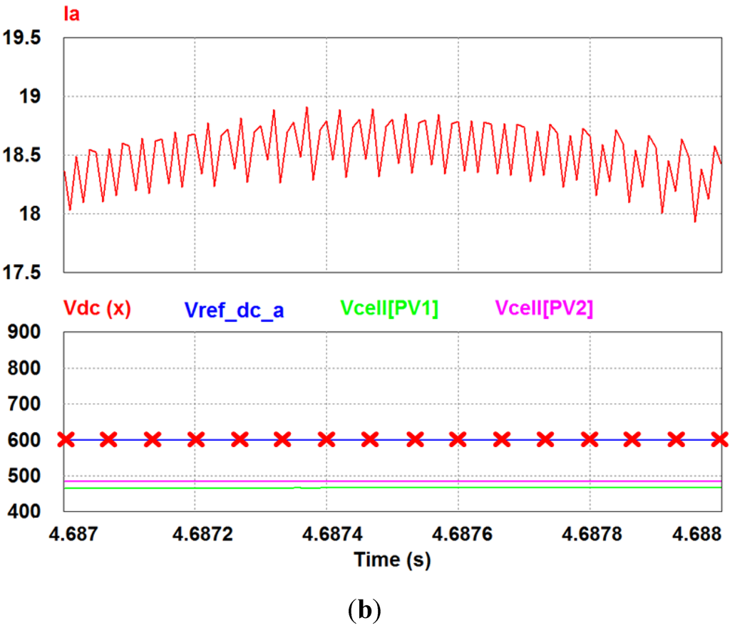 Figure 16a shows the results of the simulation using the DC-link reference voltage to 800 V at the same conditions and Figure 16b is enlarged from Figure 15.