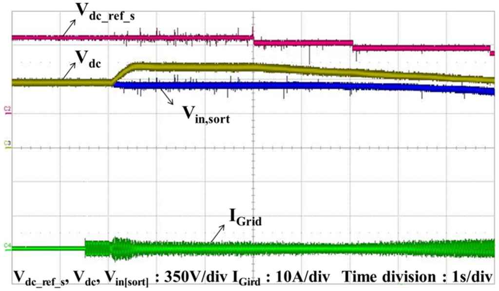 The DC-link reference voltage is chosen to be 800 V because the sorted voltage is higher than 700 V. The system operation is the same as that in simulations. The MPPT algorithm causes the sorted voltage to decrease and the grid current to increase; the DC-link reference voltage is decreased according to the sorted voltage.